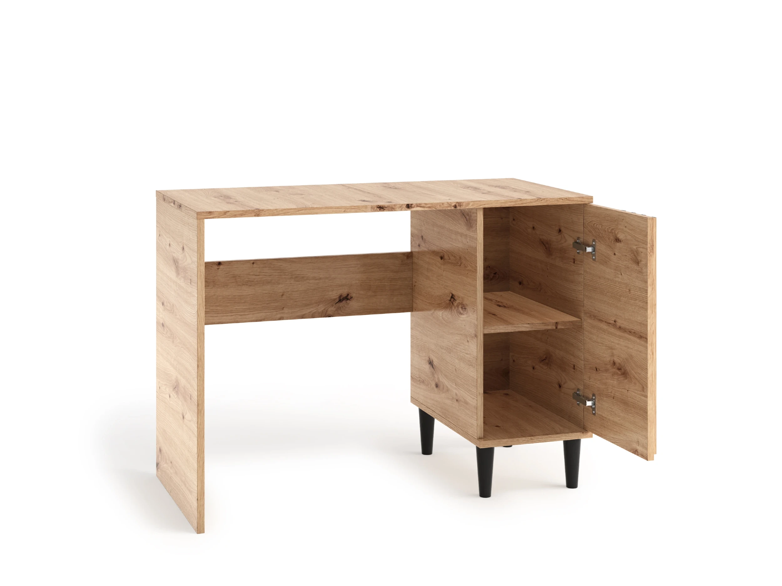 Szeroki blat zapewnia odpowiednią ilość miejsca na laptopa, dokumenty, zeszyty lub książki, co czyni z tego modelu idealną przestrzeń roboczą. Praktyczna szafka z drzwiczkami umieszczona pod blatem pozwala na wygodne przechowywanie akcesoriów biurowych, zeszytów czy kabli. Stabilna konstrukcja wykonana z płyty laminowanej 16 mm została dodatkowo zabezpieczona okleiną ABS, która zwiększa odporność mebla na uszkodzenia mechaniczne, zarysowania i wilgoć.