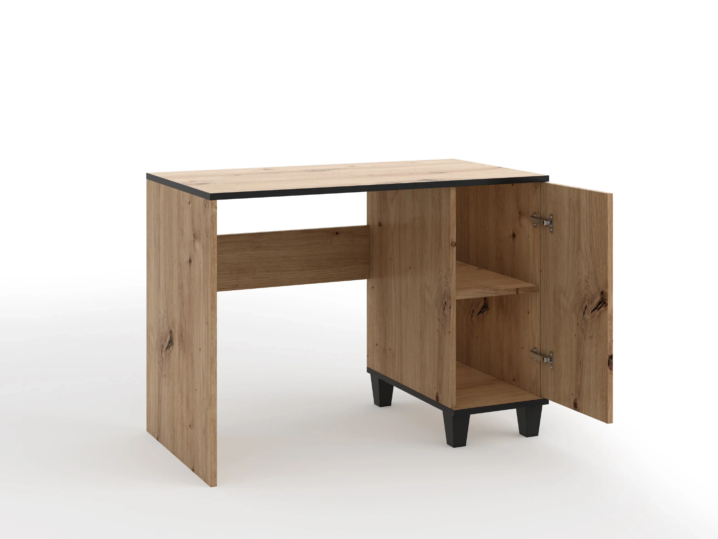 Biurko POLA P8 to praktyczny mebel, który doskonale sprawdzi się zarówno w domowym biurze, jak i w pokoju młodzieżowym. Wyposażone w pojemną szafkę z otwieranymi drzwiczkami oraz wewnętrzną półkę, zapewnia wygodne miejsce do przechowywania dokumentów, przyborów biurowych czy elektroniki. Nowoczesny design z czarnymi nóżkami i wstawkami nadaje całości wyjątkowego charakteru i lekkości wizualnej.