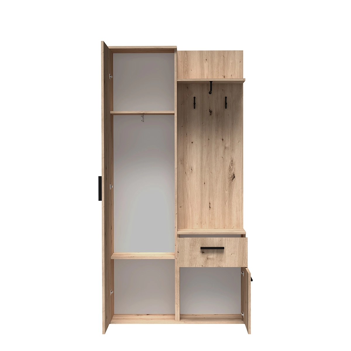 Garderoba do przedpokoju LAVIA w kolorze dąb artisan pozwala wygodnie zorganizować strefę wejścia bez dokładania kilku osobnych mebli. W jednej bryle masz miejsce na okrycia, lustro do szybkiego sprawdzenia wyglądu przed wyjściem, praktyczne siedzisko oraz zamykaną część na obuwie lub podręczne akcesoria. Ciepły dekor drewna dobrze ociepla wnętrze i pasuje do nowoczesnych, loftowych oraz bardziej klasycznych aranżacji.