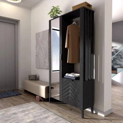 Garderoba do przedpokoju NESTA to propozycja dla osób, które chcą uporządkować strefę wejścia, ale jednocześnie zależy im na mocniejszym, nowoczesnym wyglądzie wnętrza. Wysoka bryła z lustrem, otwartą częścią na odzież i zamykaną dolną strefą dobrze wykorzystuje miejsce, a ciemne wykończenie w kolorze czarnym nadaje całości bardziej elegancki, wyrazisty charakter. To mebel, który sprawdza się nie tylko użytkowo, ale też wizualnie porządkuje przedpokój.