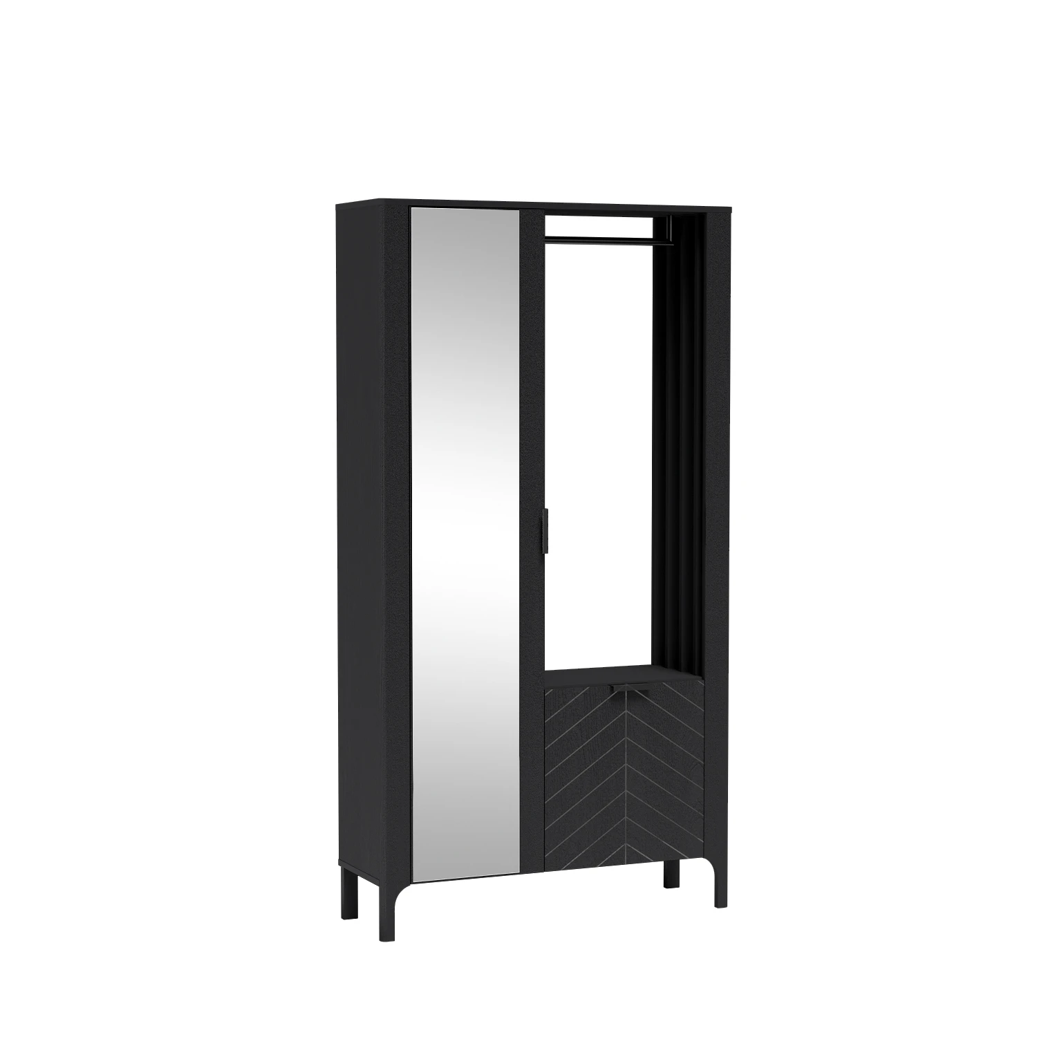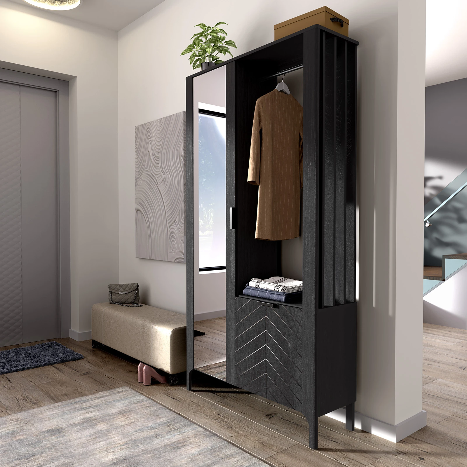 Garderoba do przedpokoju NESTA – czarny painflow, nowoczesna szafa garderoba z lustrem, wysokimi nogami i frontem 3D