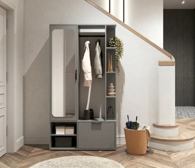 Garderoba do przedpokoju SENA w kolorze grafit to dobry wybór, jeśli zależy Ci na bardziej wyrazistym, nowoczesnym efekcie i funkcjonalnym zagospodarowaniu strefy wejścia. Ciemniejsza kolorystyka nadaje bryle charakteru, a jednocześnie dobrze łączy się z drewnem, bielą i czarnymi dodatkami. To meble do przedpokoju zamknięte w jednej kompaktowej formie – z lustrem, miejscem na odzież, półkami i szafką.