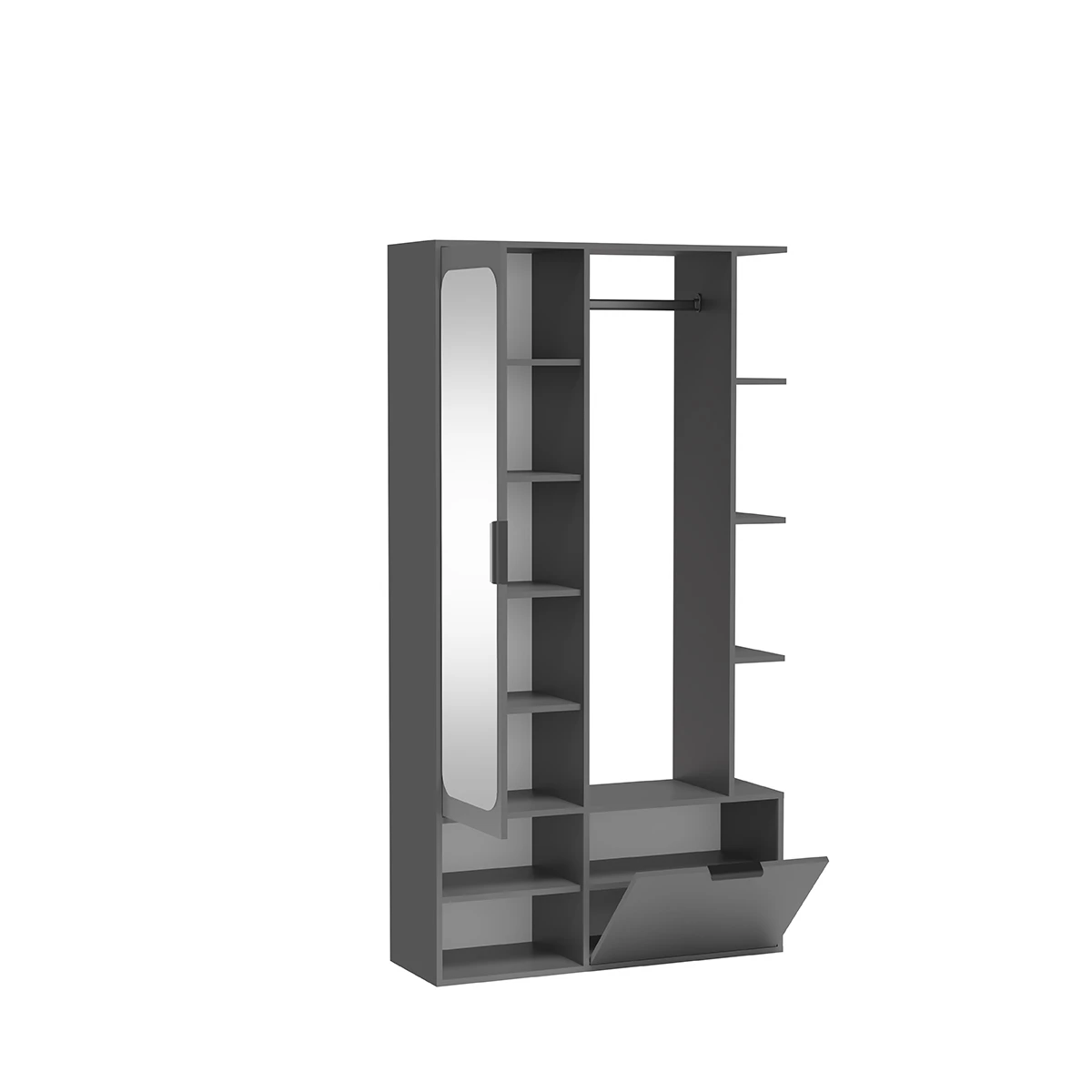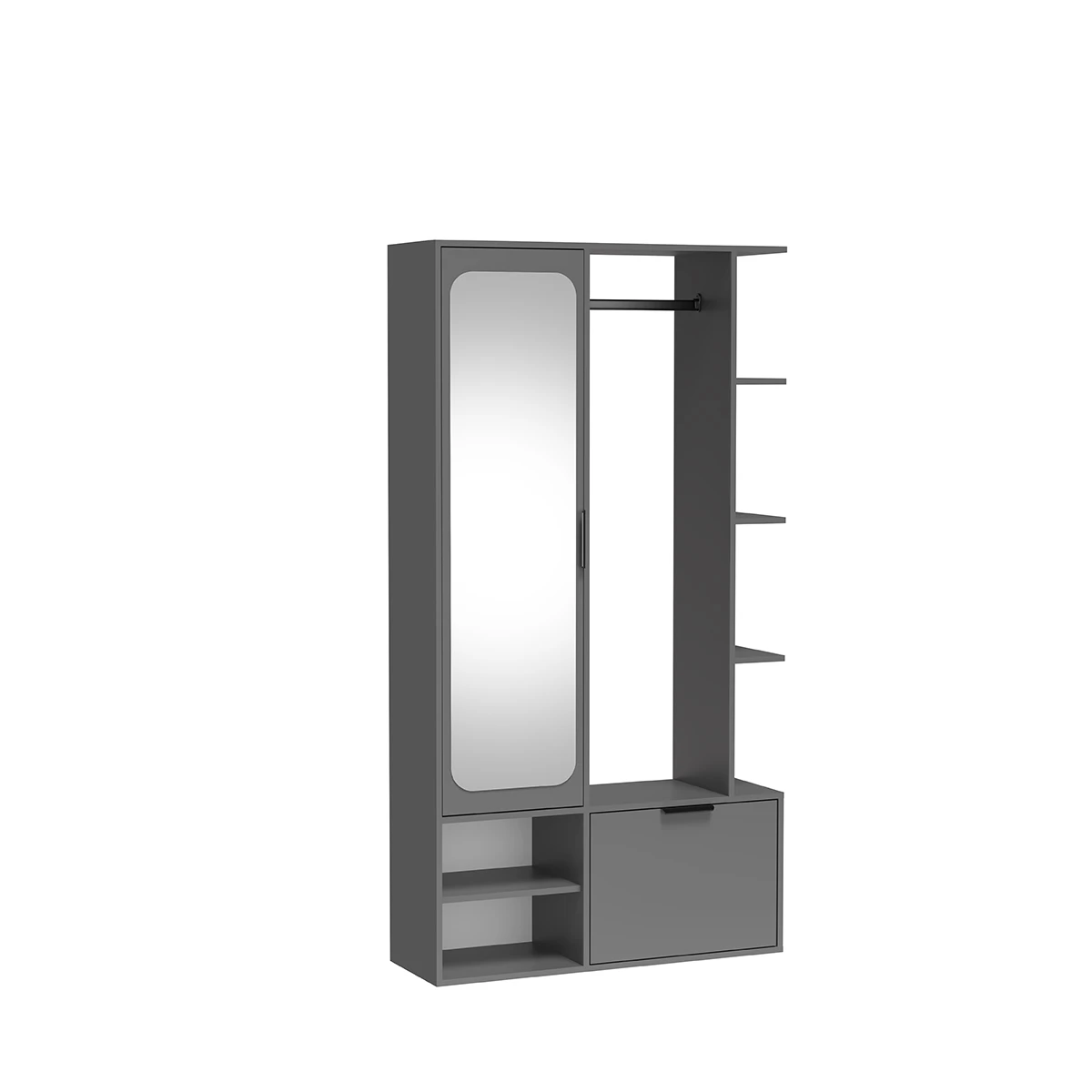 Garderoba do przedpokoju SENA – grafit, nowoczesna szafka do przedpokoju z lustrem, półkami i otwartą strefą na kurtki