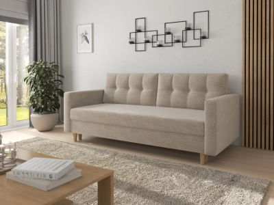 Kanapa Lazaro została wyposażona w funkcję spania typu DL, umożliwiającą szybkie rozkładanie – to idealne rozwiązanie na wieczorny relaks lub nocleg dla gości. Pojemnik na pościel wbudowany pod siedziskiem zapewnia dodatkowe miejsce do przechowywania, pomagając utrzymać porządek w pomieszczeniu. Dla maksymalnego komfortu i trwałości, siedzisko i oparcie kanapy wykonano z zastosowaniem połączenia sprężyn bonell oraz sprężyn falistych. Takie połączenie sprawia, że mebel jest nie tylko miękki i wygodny, ale także wytrzymały i odporny na odkształcenia, dzięki czemu idealnie sprawdza się zarówno do codziennego siedzenia, jak i spania.