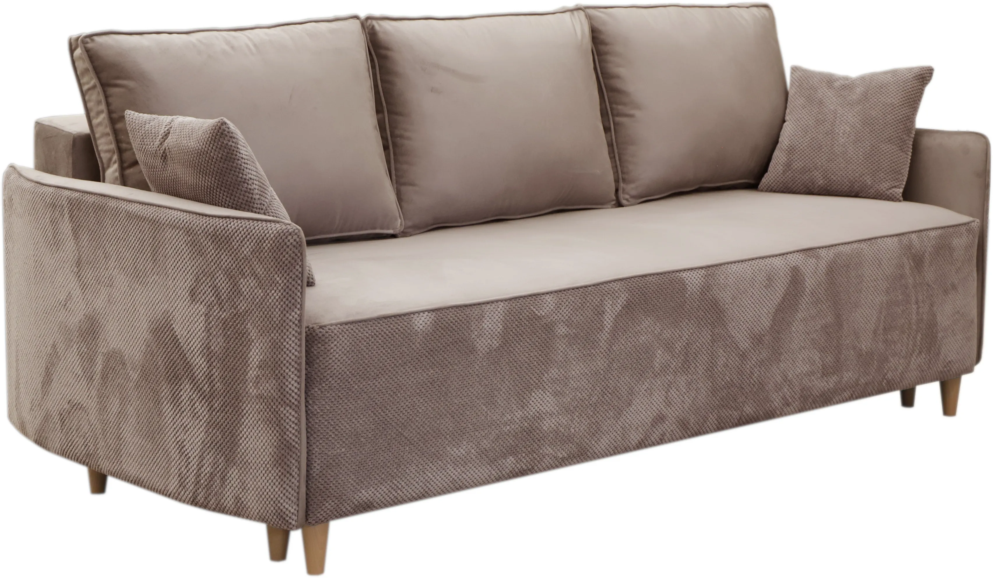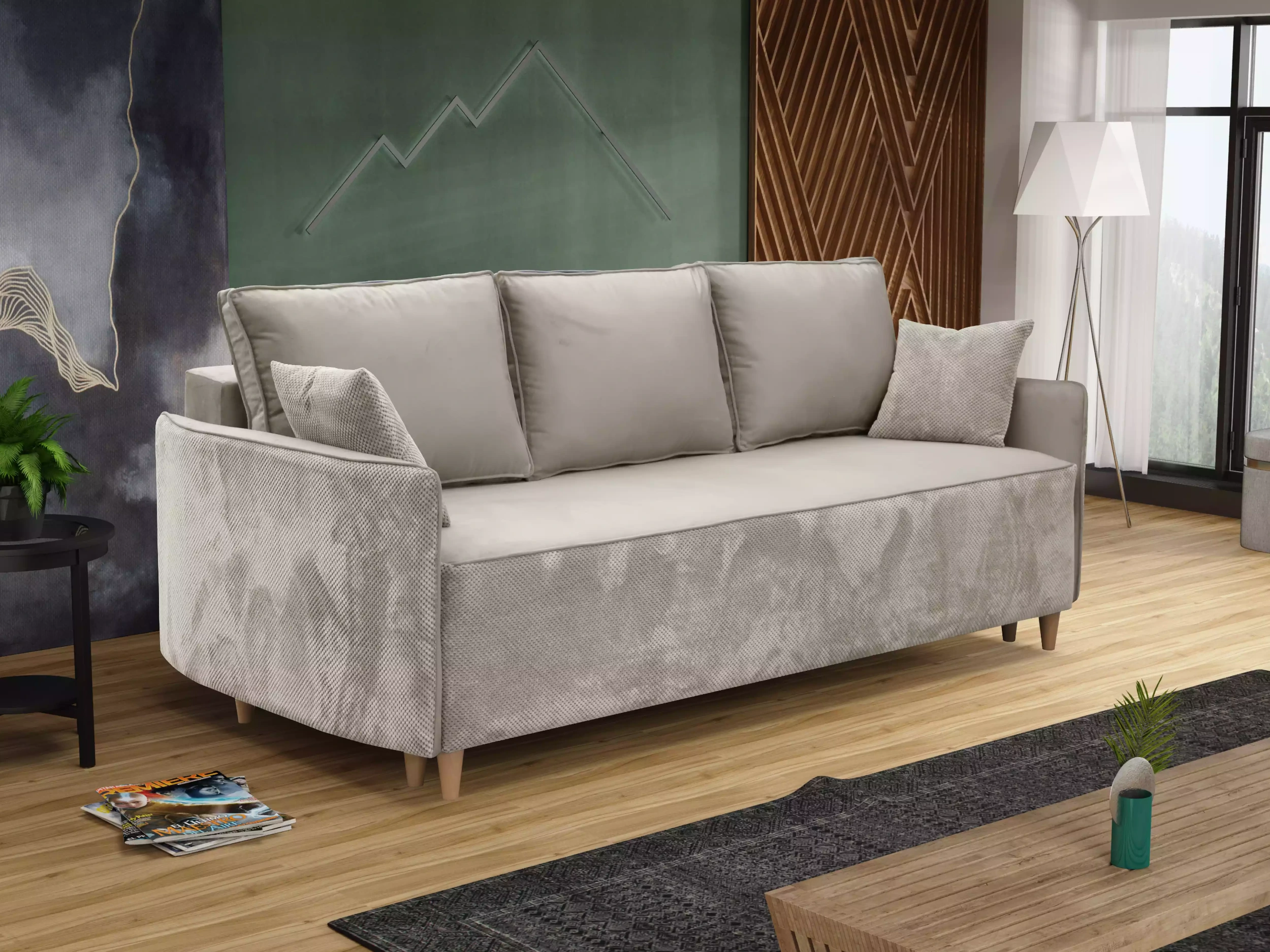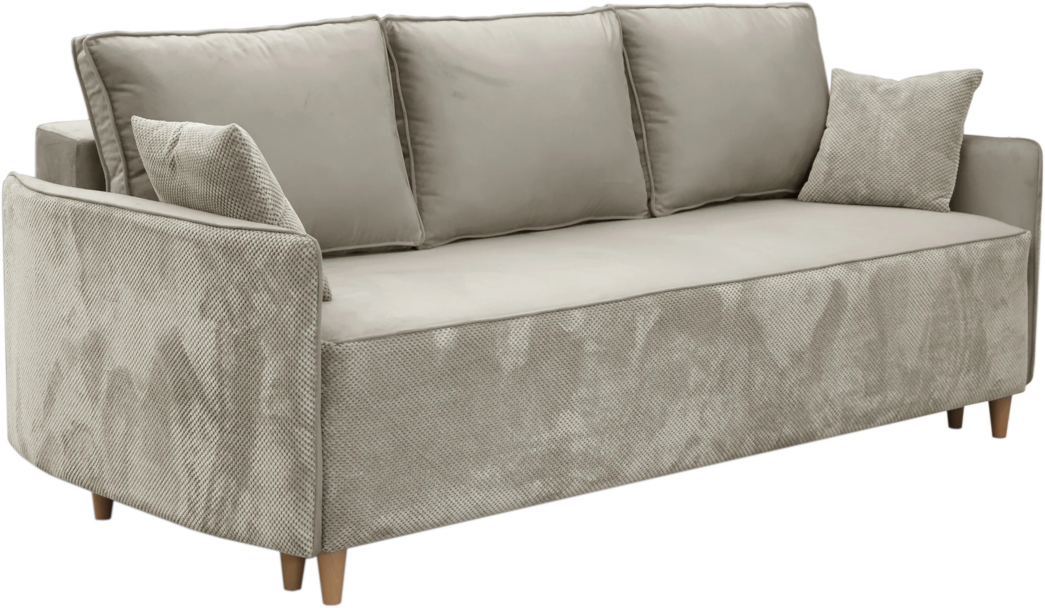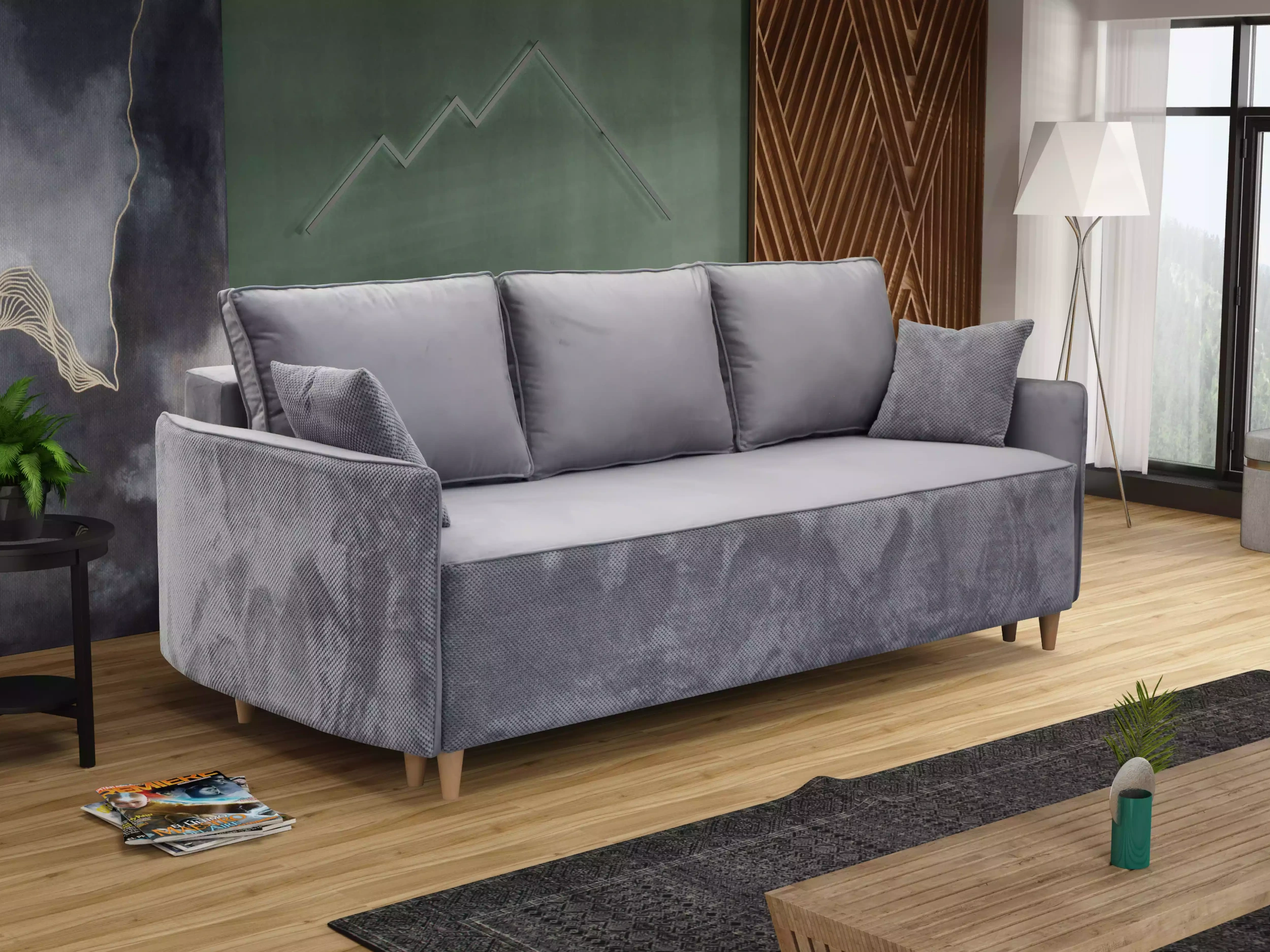 Dzięki funkcji spania kanapa w kilka chwil zamienia się w wygodne łóżko. Wbudowany pojemnik na pościel ułatwia utrzymanie porządku w salonie, a dołączone małe poduszki jaśki dodają jej przytulnego charakteru.
