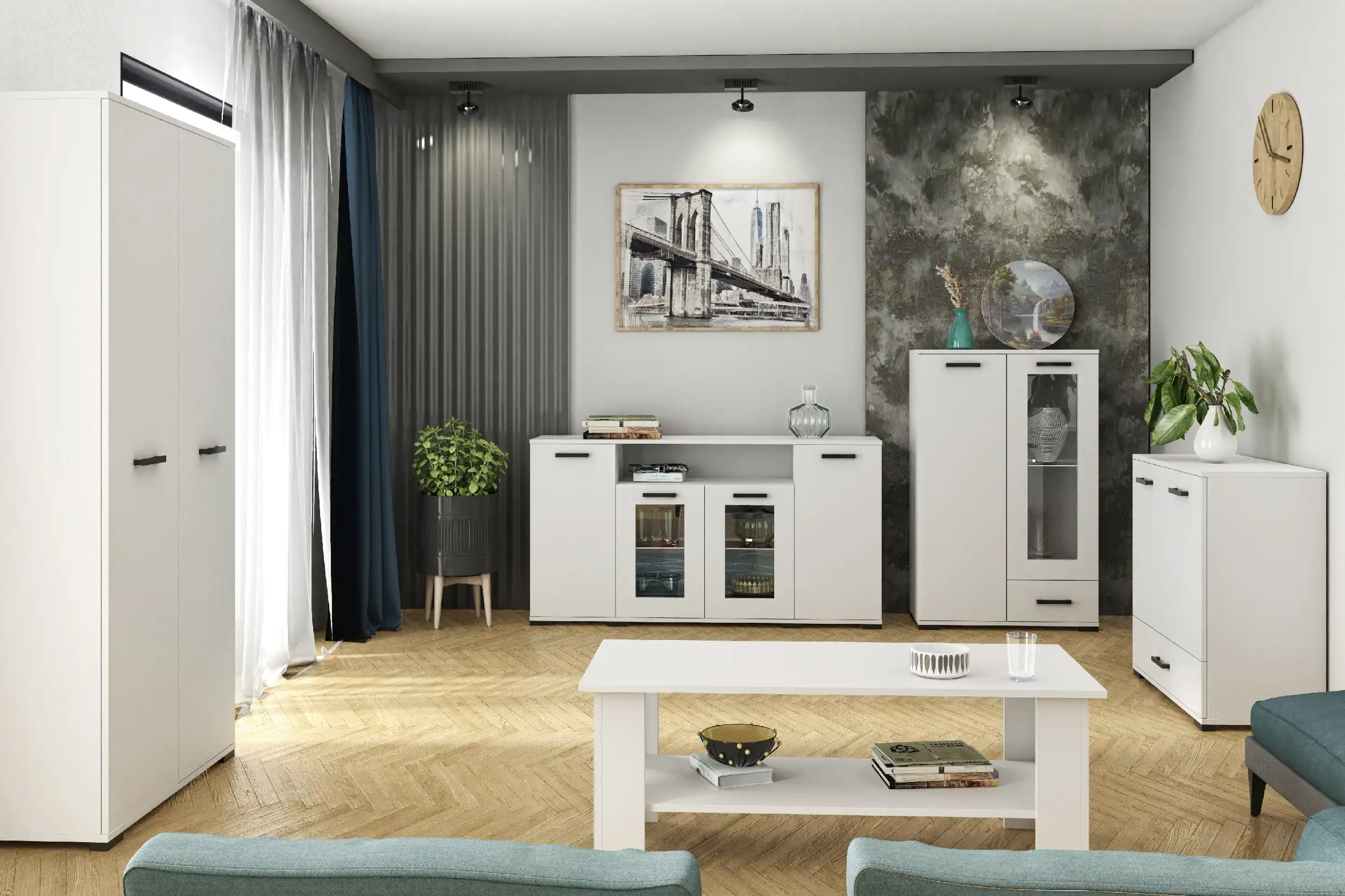 W kolekcji znajdziesz funkcjonalne komody, witryny i stoliki, które świetnie sprawdzą się w salonie, sypialni lub gabinecie. Meble wykonane są z płyty laminowanej 16 mm i zabezpieczone obrzeżem ABS odpornym na ścieranie i wilgoć.