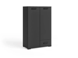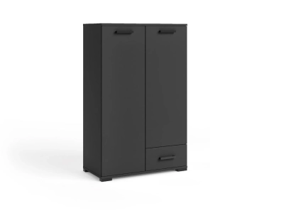 Zastosowanie zamykanych półek oraz dolnej szuflady sprawia, że łatwiej posegregować zawartość i uniknąć bałaganu w strefie dziennej. Czarna komoda dobrze prezentuje się w salonie, sypialni, jadalni albo gabinecie, zwłaszcza jeśli zależy Ci na mocniejszym akcencie kolorystycznym. Mimo ciemnego wykończenia bryła pozostaje prosta i uporządkowana, dlatego nie wygląda ciężko.