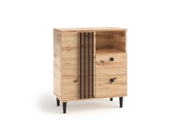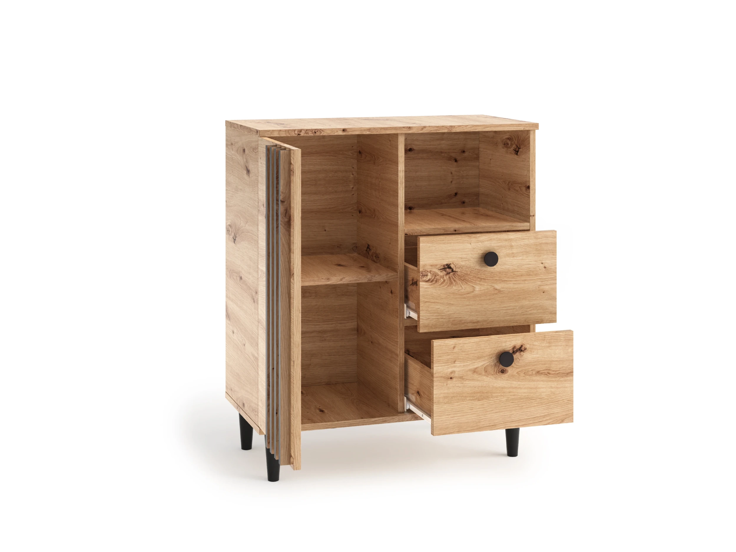 Mebel wyposażono w trzy pojemne szuflady na prowadnicach rolkowych oraz otwartą wnękę na ozdoby lub dekoracje. Komoda została wykonana z wysokiej jakości płyty laminowanej 16 mm z obrzeżami zabezpieczonymi trwałą okleiną ABS.