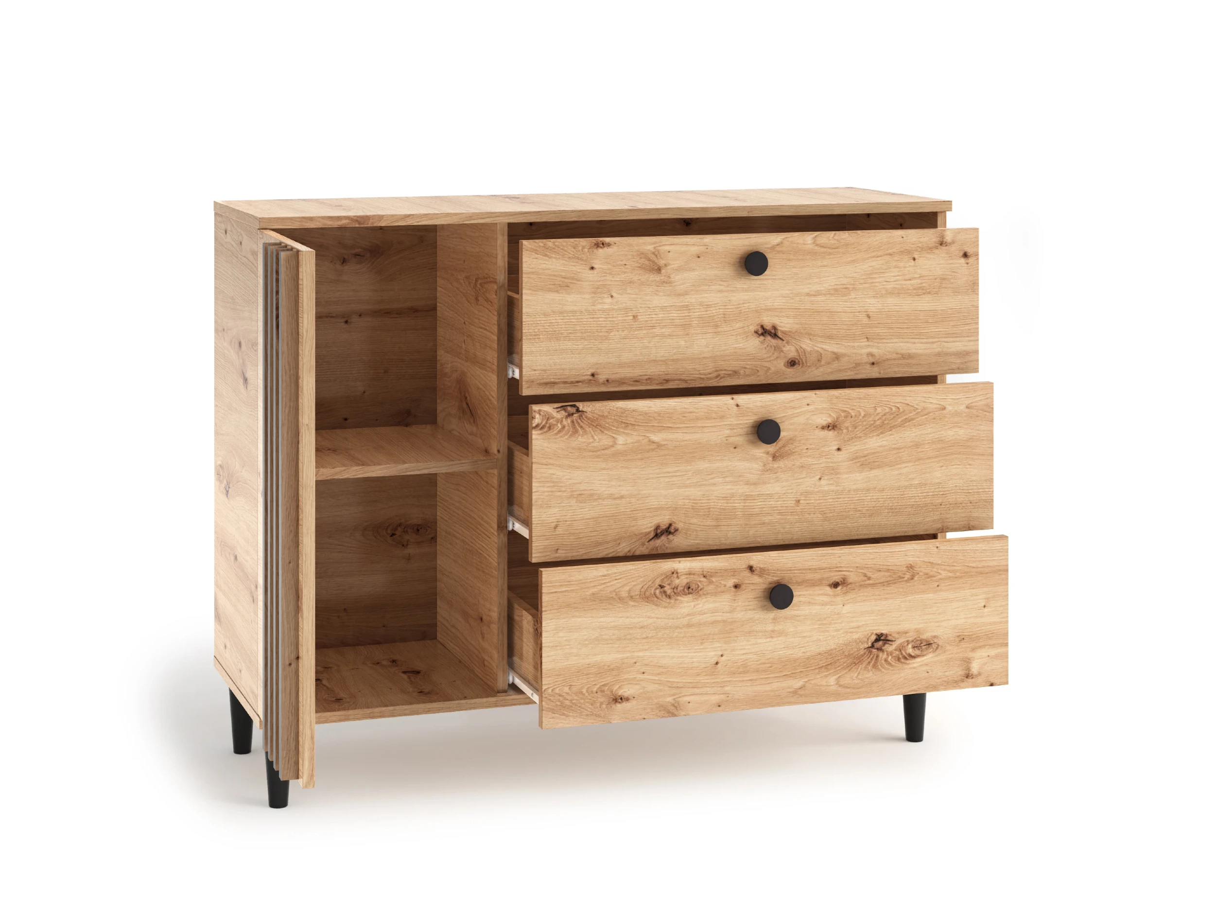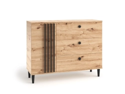 Komoda LANA L3 to funkcjonalny mebel o jednodrzwiowej konstrukcji, wyposażony w trzy pojemne szuflady, idealne do przechowywania odzieży lub drobiazgów. Utrzymana w modnym industrialnym stylu, z dekoracyjnymi czarnymi lamelami na froncie, które kontrastują z korpusem w kolorze Dąb Artisan. To praktyczne i estetyczne rozwiązanie do salonu, pokoju dziennego czy sypialni.