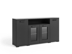Komoda z witryną daje Ci praktyczne miejsce na przechowywanie, a przy tym nie wygląda ciężko dzięki przeszklonym frontom pośrodku. W zamkniętych szafkach można schować to, co nie musi być widoczne, a część witrynowa dobrze nadaje się na szkło, dekoracje lub książki. Opcjonalne oświetlenie LED dodatkowo podkreśla wnętrze i sprawia, że mebel wieczorem prezentuje się jeszcze ciekawiej. Całość zachowuje spójny wygląd dzięki czarnym uchwytom i nóżkom.