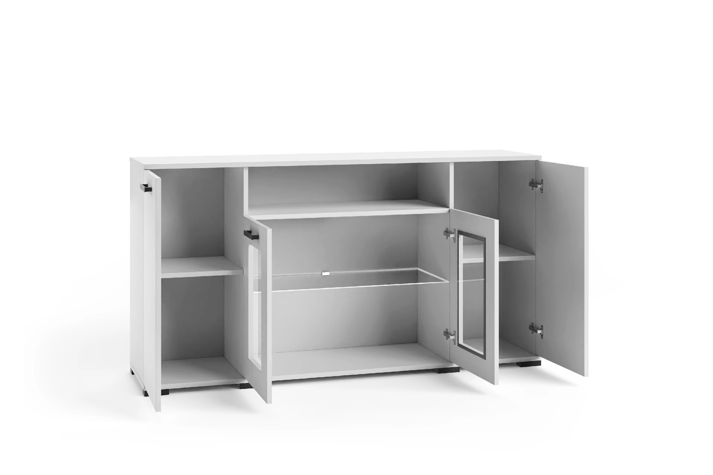 W środku znajdziesz miejsce na zastawę, tekstylia, dokumenty albo inne rzeczy, które lepiej schować za pełnym frontem. Przeszklona część sprawdzi się na szkło, dekoracje lub dodatki, które chcesz subtelnie podkreślić, a opcjonalne oświetlenie LED pozwala jeszcze bardziej wyesponować jej zawartość. Komoda przeszklona w odcieniu kaszmiru nie przytłacza aranżacji, a czarne uchwyty i nóżki ładnie porządkują całą bryłę i dodają jej bardziej wyrazistego charakteru.