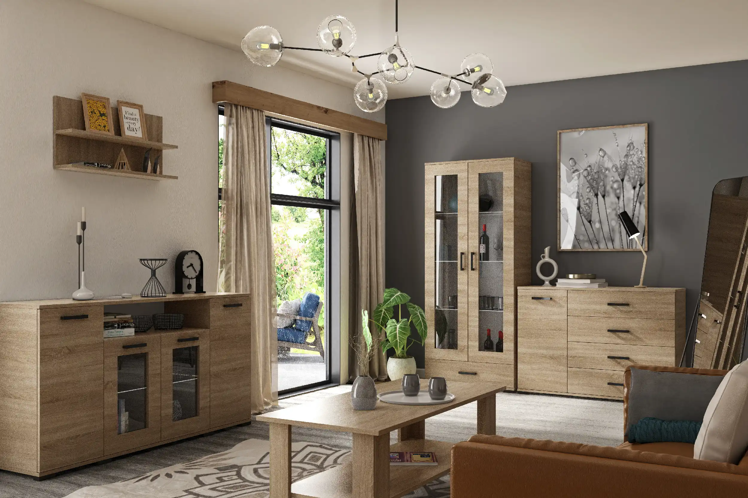 Komoda przeszklona pomaga uporządkować przestrzeń bez wrażenia ciężkiej zabudowy. Wnętrze daje miejsce zarówno na rzeczy codzienne, jak i na dekoracje, szkło czy porcelanę. Opcjonalne oświetlenie LED może dodatkowo podkreślić zawartość części witrynowej i nadać meblowi bardziej dekoracyjny charakter. Jasny dekor drewna i czarne detale tworzą razem nowoczesne, ale nadal bardzo uniwersalne połączenie.