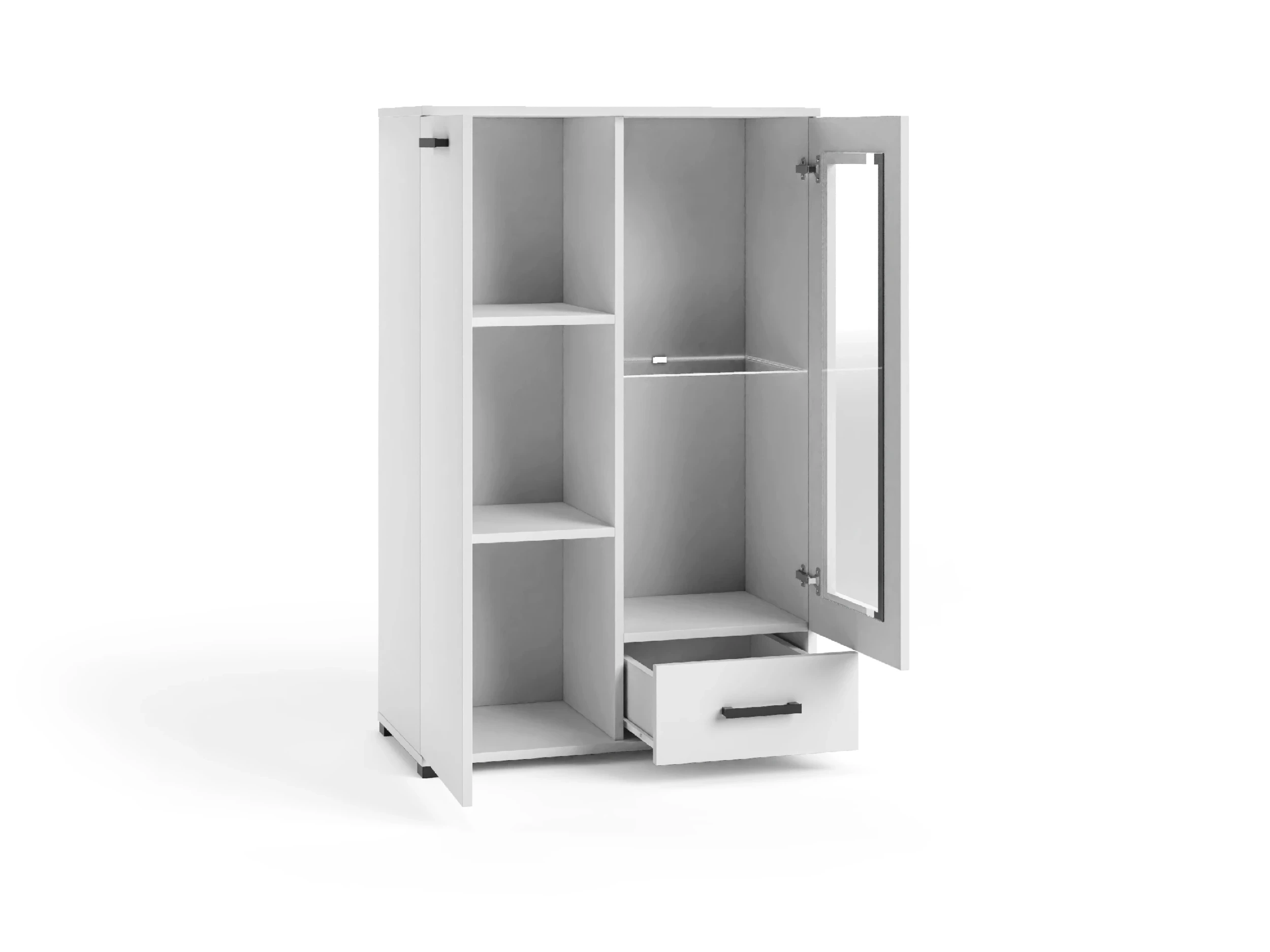- Przeszklona część – idealna na dekoracje, szkło, porcelanę lub dodatki, które chcesz uporządkować i lekko wyeksponować.