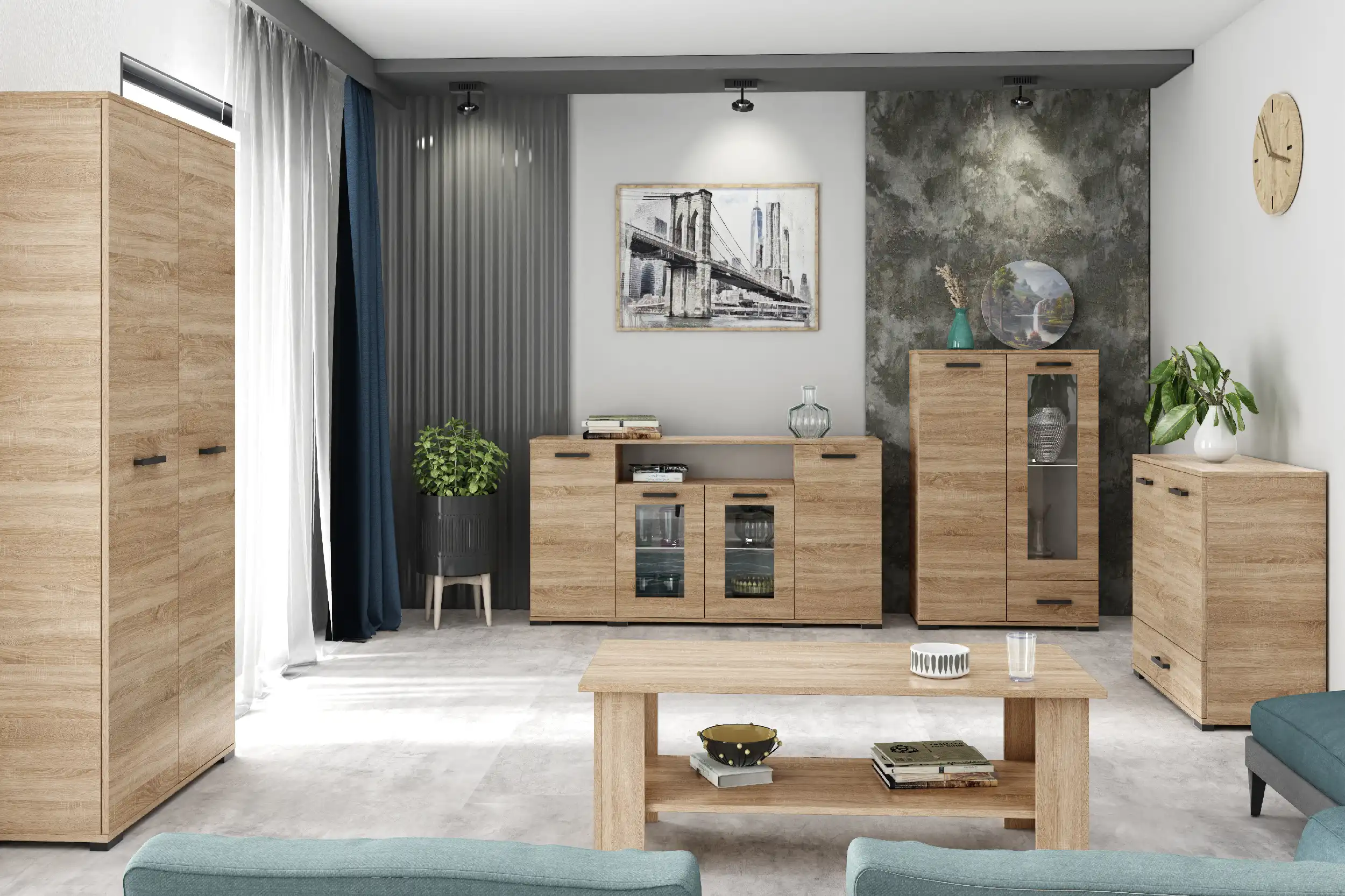 System FELIA w odcieniu dąb sonoma to doskonały wybór do salonu, jadalni, gabinetu czy pokoju młodzieżowego. Kolor ten wprowadza naturalność i światło, dzięki czemu wnętrze zyskuje na lekkości.