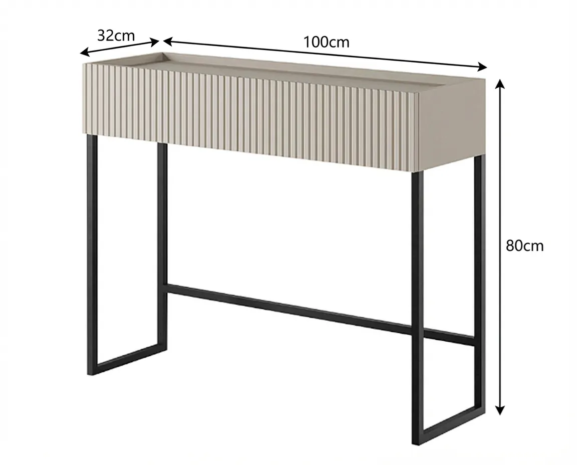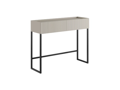 Konsola z szufladami COMO C07 to mebel, który łączy nowoczesny wygląd z praktycznym zastosowaniem w codziennym użytkowaniu. Prosta, a jednocześnie dopracowana forma w modnym kolorze kaszmir została uzupełniona ryflowanym frontem z MDF, który nadaje całości charakteru i delikatnie przełamuje minimalistyczny design. Smukły, czarny stelaż z metalu malowanego proszkowo sprawia, że bryła wygląda lekko i dobrze wpisuje się w nowoczesne oraz bardziej eleganckie wnętrza.