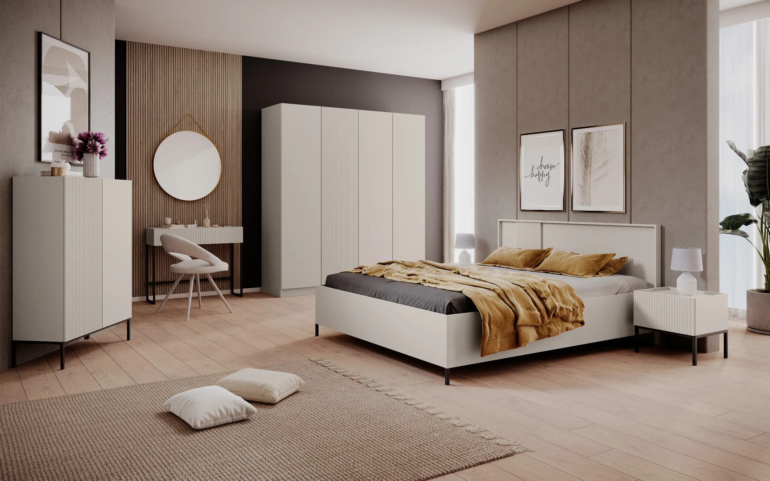 W skład systemu wchodzą: łóżko, szafy, stolik kawowy, witryny, szafki RTV, komody, stoliki nocne i konsole, które możesz dowolnie łączyć, tworząc spójną aranżację salonu, sypialni lub pokoju dziennego. Detale w postaci ryflowanych elementów podkreślają nowoczesny charakter zestawu, idealnie wpisując się w aktualne trendy wnętrzarskie.