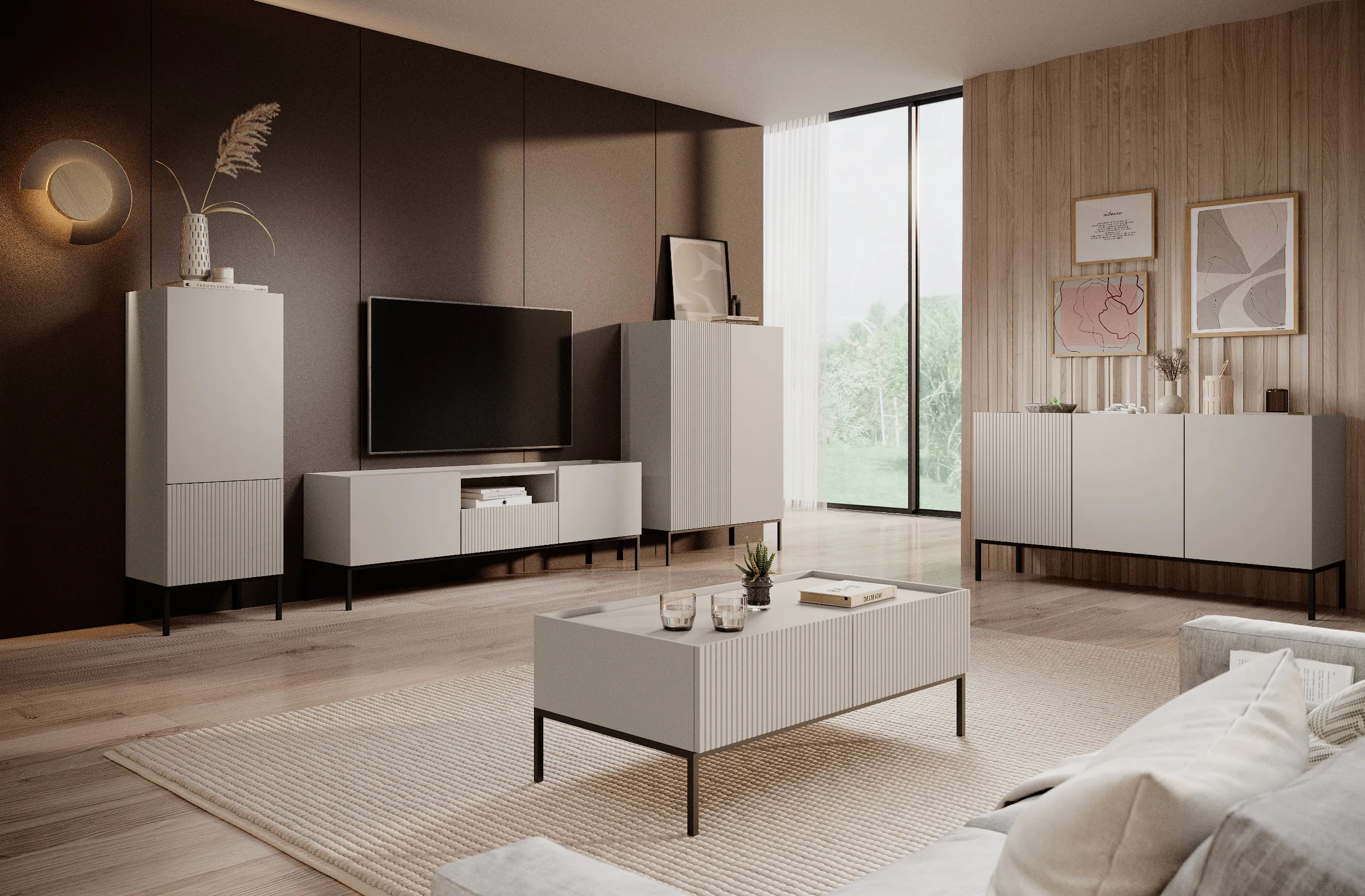W skład systemu wchodzą: łóżko, szafa, stolik kawowy, witryny, szafki RTV, komody, stoliki nocne i konsole, które możesz dowolnie łączyć, tworząc spójną aranżację salonu, sypialni lub pokoju dziennego. Detale w postaci ryflowanych elementów podkreślają nowoczesny charakter zestawu, idealnie wpisując się w aktualne trendy wnętrzarskie.