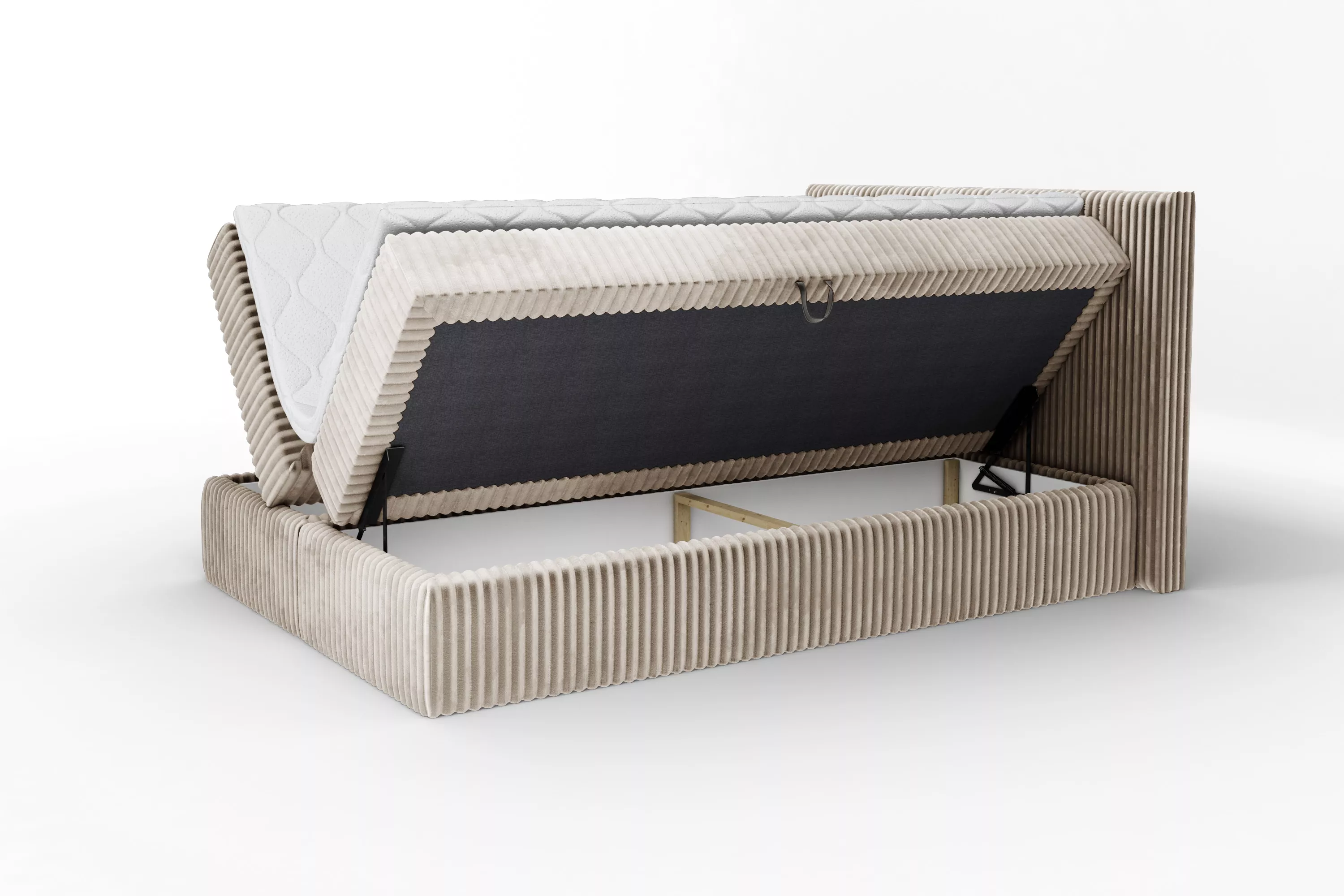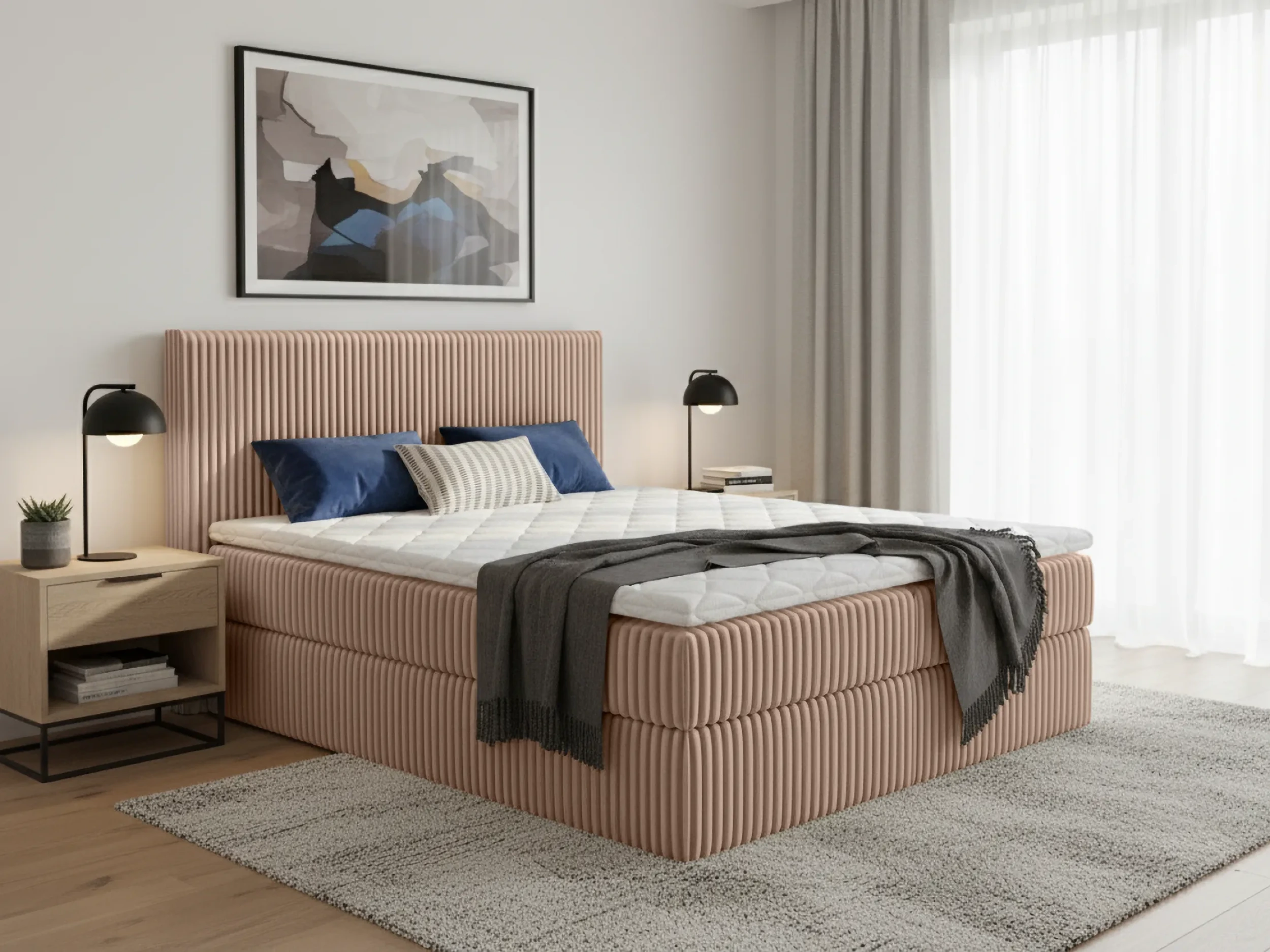Łóżko Nela zachwyca nowoczesnym designem i wysokiej jakości tkaniną. Wysokie wezgłowie nie tylko chroni ścianę przed zabrudzeniami, ale także stanowi efektowny element dekoracyjny. Dwa pojemne schowki na pościel z automatami wspomagającymi podnoszenie dbają o porządek w sypialni i zapewniają łatwy dostęp do przechowywanych rzeczy. Łóżko kontynentalne Nela 180 × 200 posiada dwa materace, które idealnie dopasowują się do krzywizn kręgosłupa, zapewniając komfortowy sen dla dwojga. Materac główny wykonany jest z wysokoelastycznej pianki i sprężyn bonell, gwarantując odpowiednie podparcie dla ciała. Opcjonalnie możesz wybrać materac typu pocket, który zapewnia jeszcze większą elastyczność i dopasowanie do indywidualnych preferencji.
