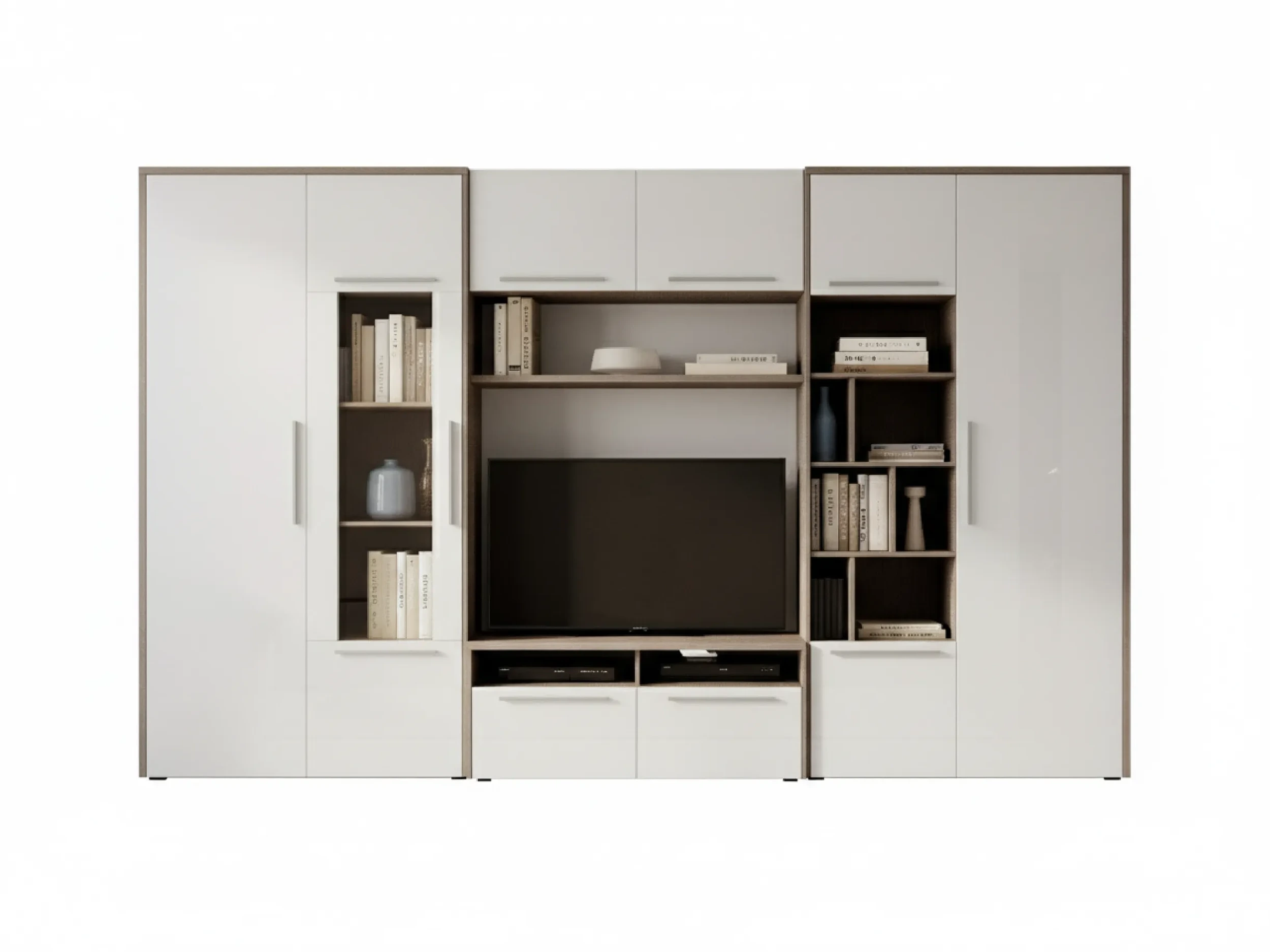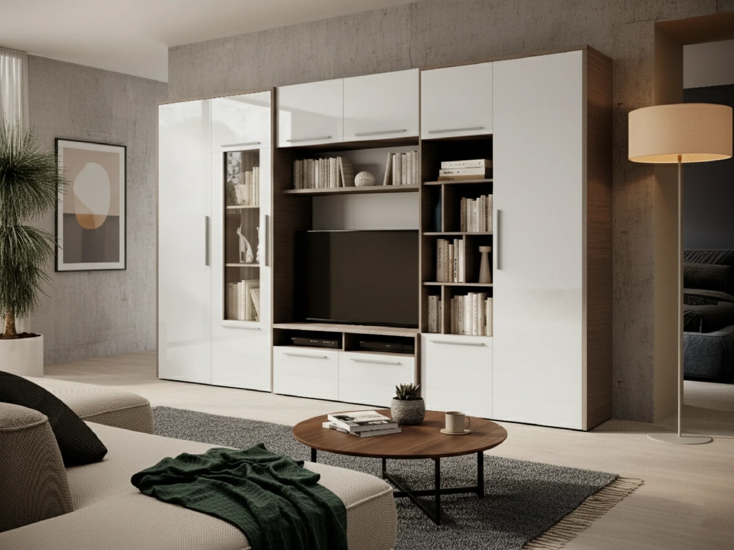 - Idealna do salonu lub pokoju dziennego – uniwersalny układ pozwala dopasować meblościankę do różnych aranżacji wnętrz.