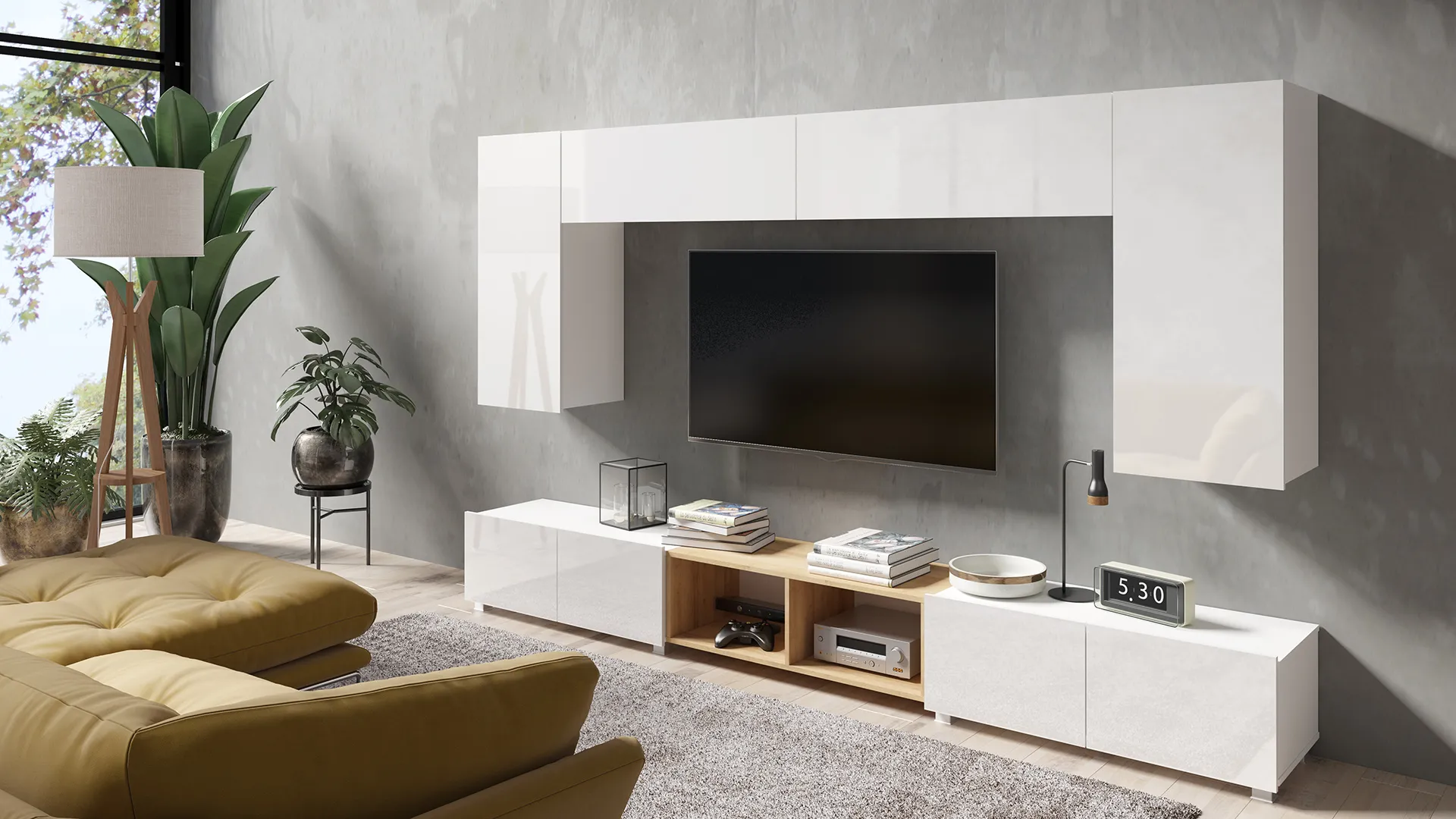 - Meblościanka do salonu – gotowy układ do nowoczesnej strefy RTV