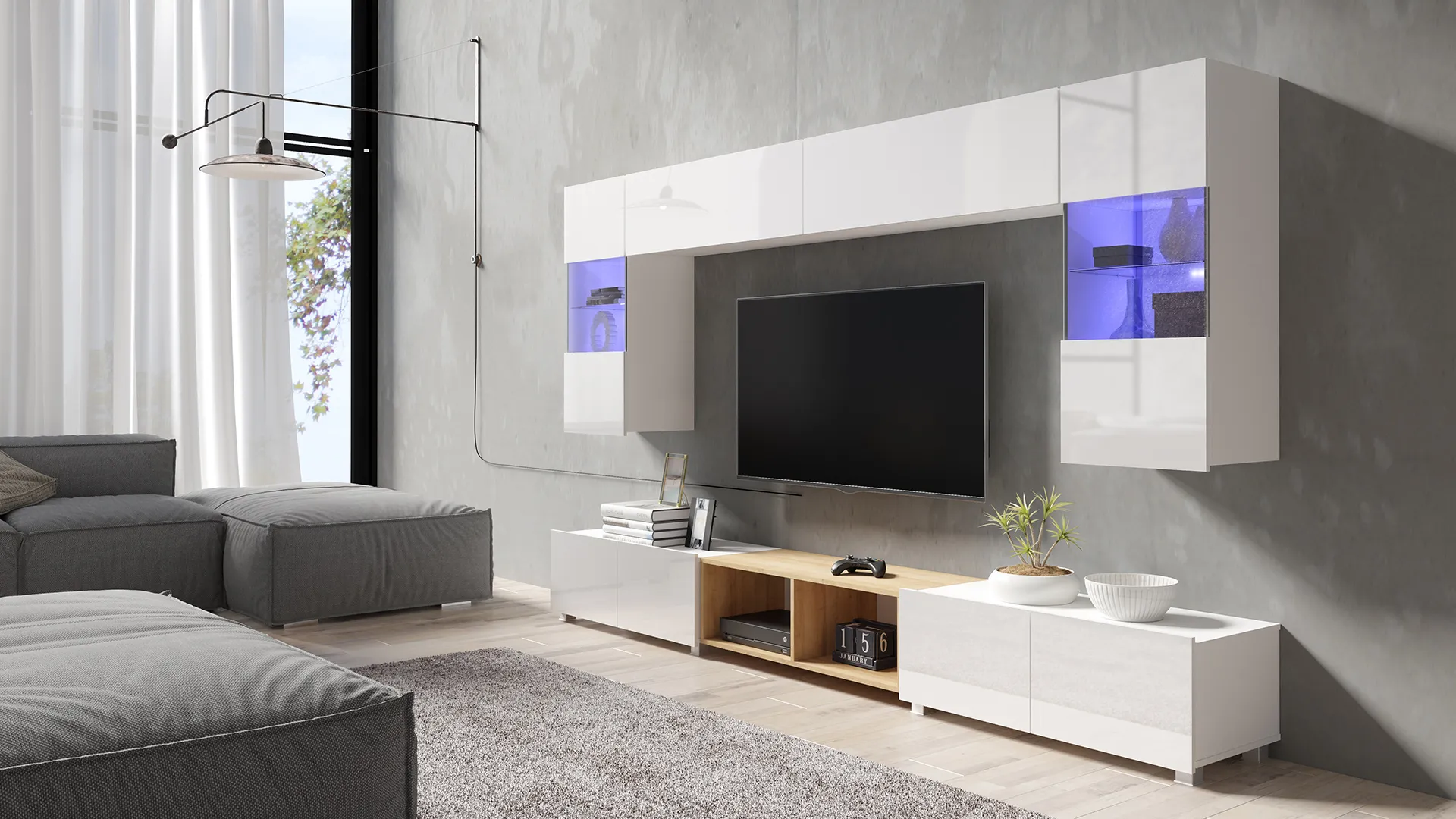 - Meblościanka do salonu – nowoczesny układ ściany RTV