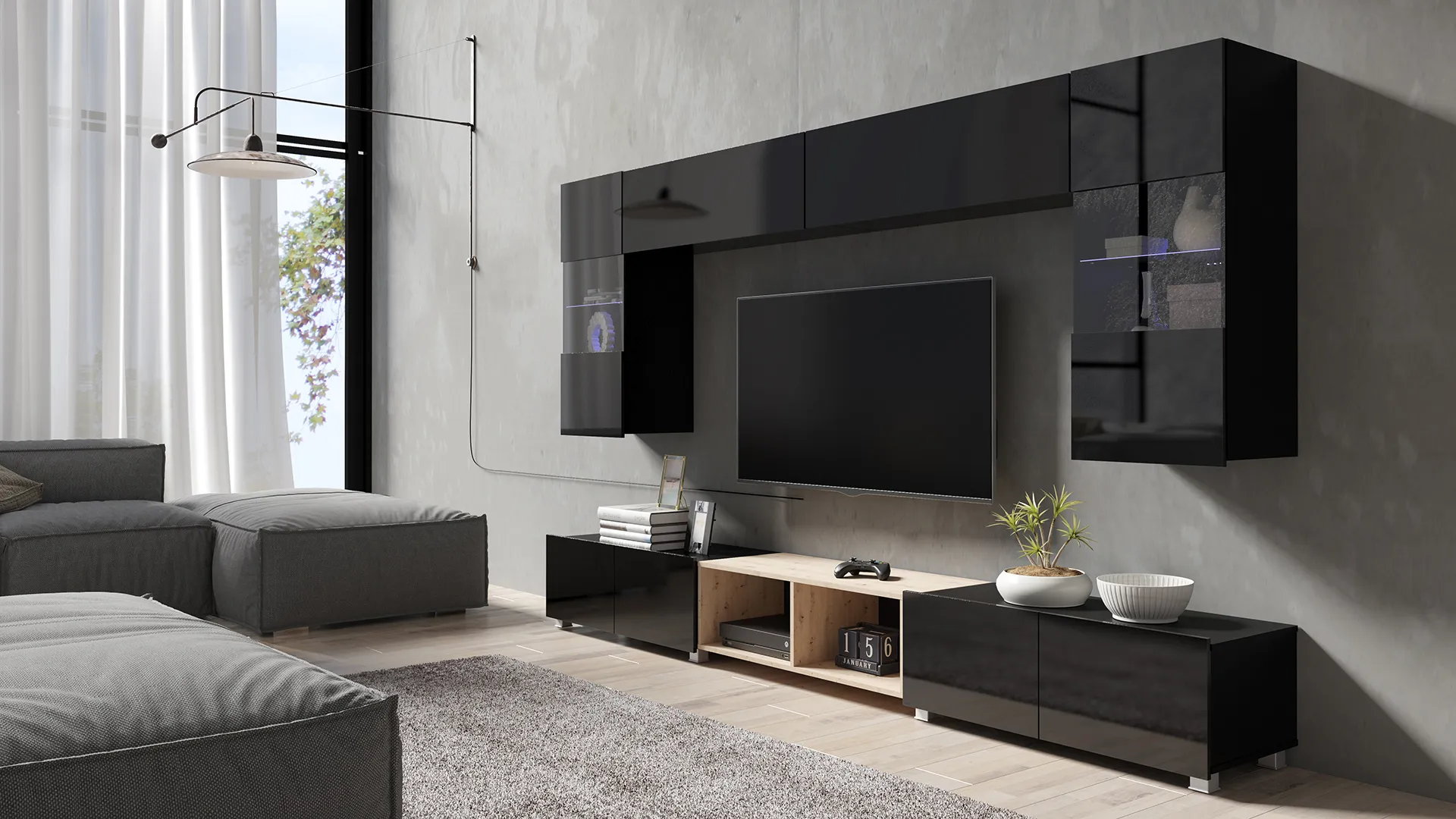 CALERO C19 dostępna jest w dwóch dopracowanych wersjach kolorystycznych: wariant czarny połysk / czarny mat z akcentem dąb artisan oraz czarnymi plecami daje mocniejszy, kontrastowy efekt i świetnie pasuje do loftowych aranżacji. Druga opcja to biały połysk / biały mat z detalem dąb złoty i białymi plecami – idealna, gdy zależy Ci na optycznym rozjaśnieniu wnętrza. Niezależnie od koloru, to meblościanka RTV, która łączy przechowywanie, ekspozycję i porządek w jednym, nowoczesnym komplecie.