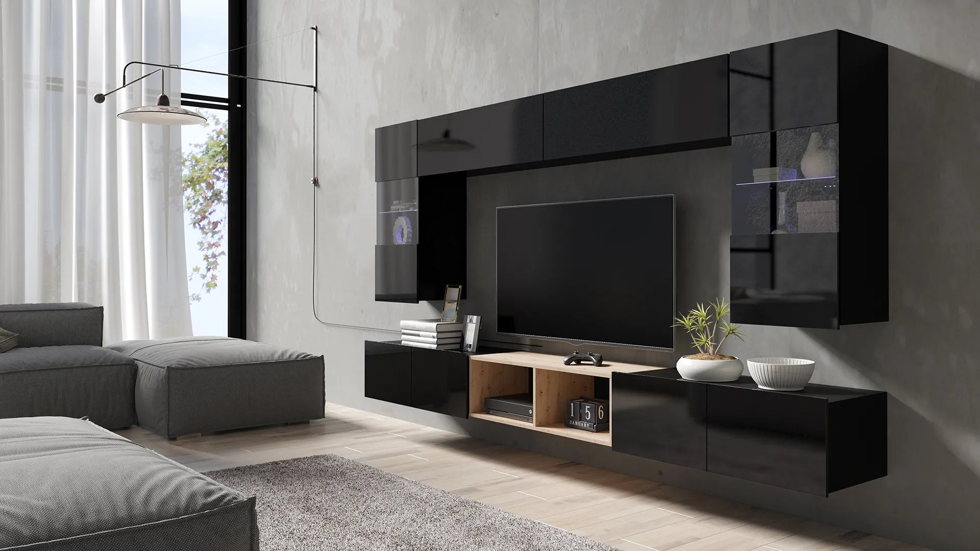 Meblościanka do salonu CALERO C19 została zaprojektowana tak, aby w jednym, spójnym układzie uporządkować strefę telewizora i dodać wnętrzu nowoczesnego charakteru. W zestawie otrzymujesz 7 elementów: 2x szafka RTV 100 cm, 2x witryna wisząca pionowa, 2x półka wisząca pozioma zamknięta oraz 1x półka otwarta. Gładkie fronty bez uchwytów podkreślają minimalistyczny styl, a rozbudowana część wisząca pozwala zbudować efektowną ścianę RTV bez wrażenia ciężkości.