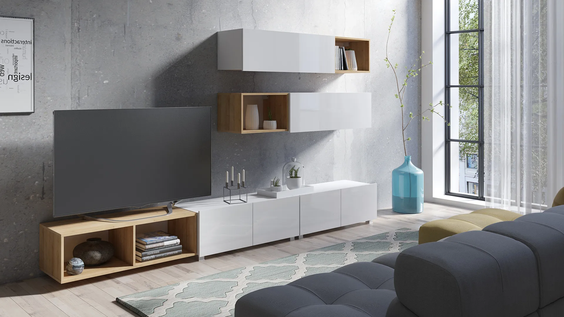 Meblościanka do salonu CALERO C20 – 7-elementowa zabudowa RTV 100 cm z zamykanymi półkami i otwartymi wnękami