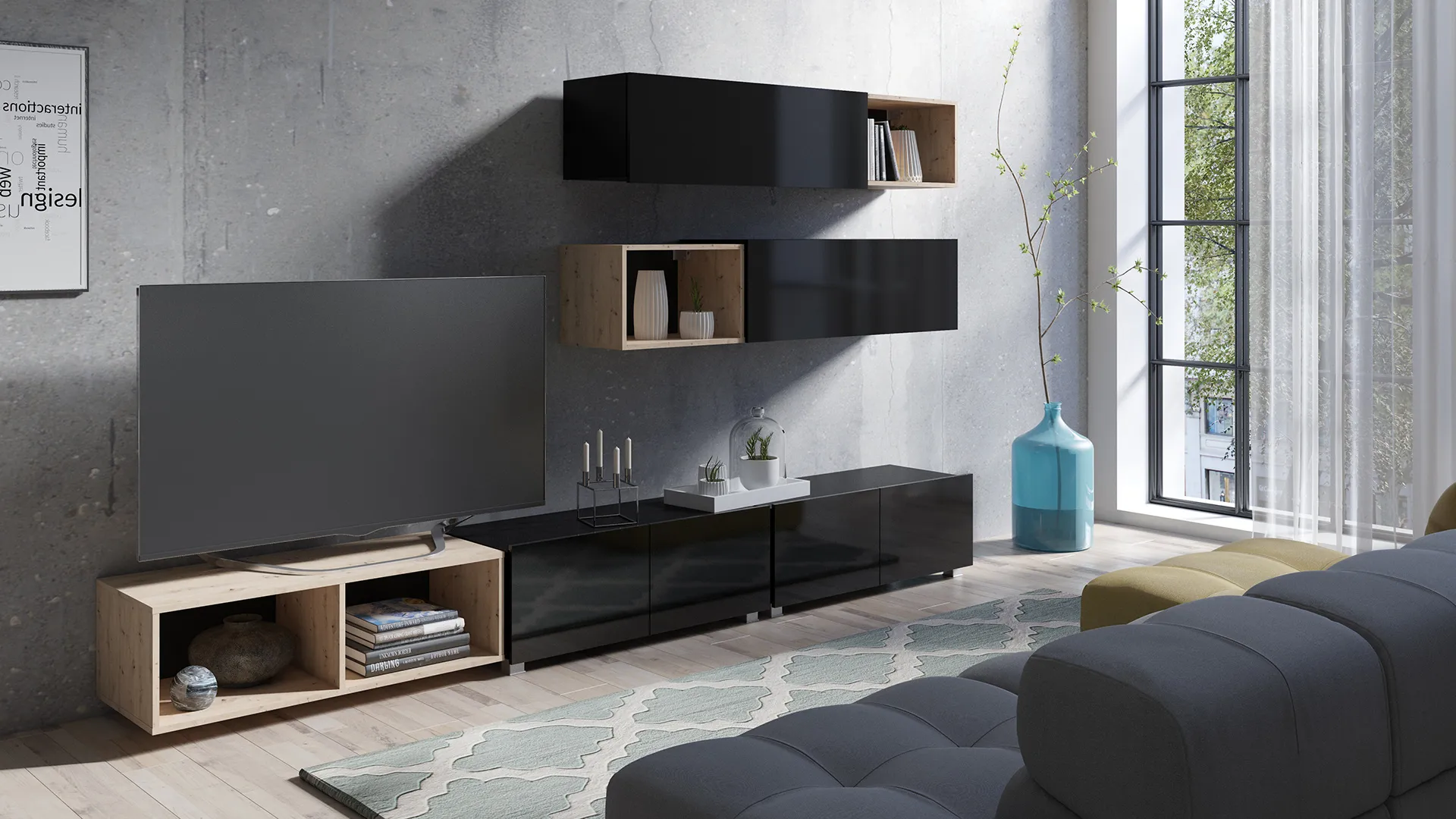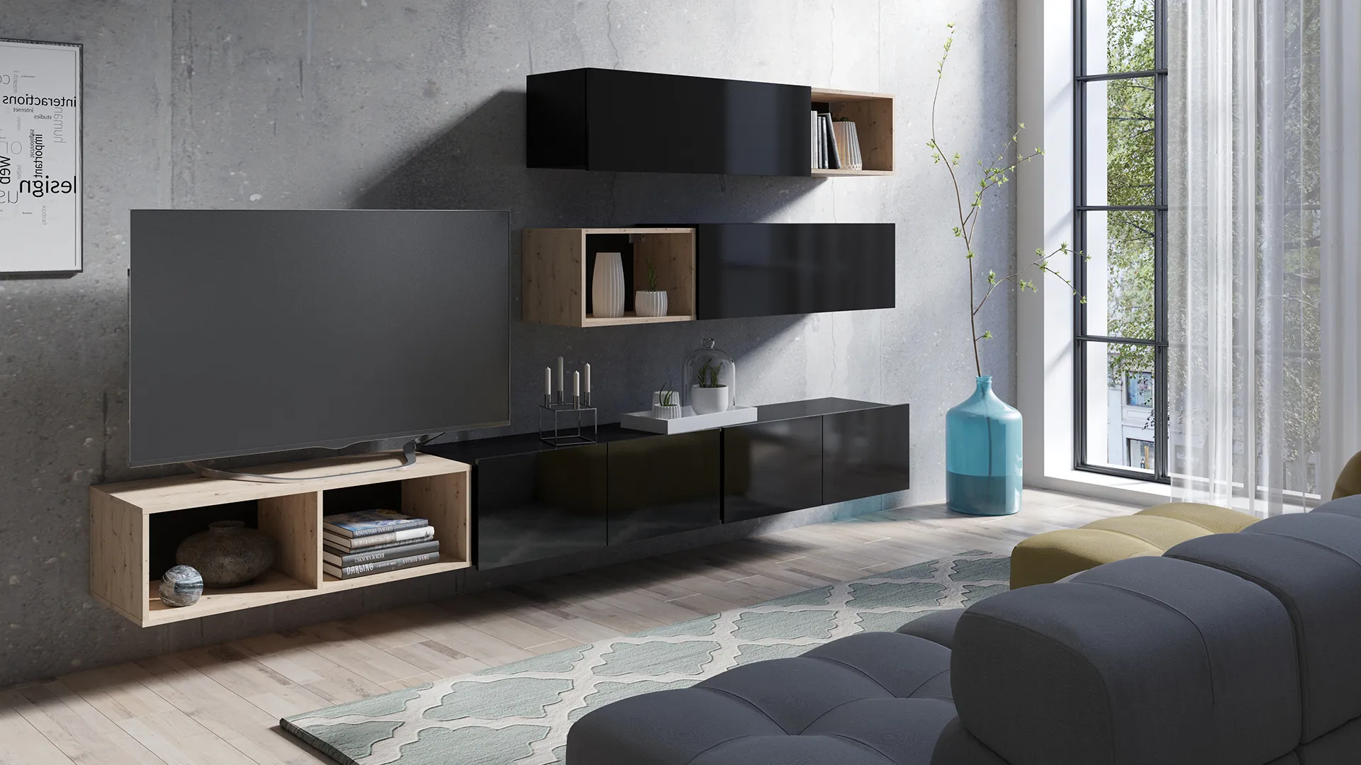 Wygodę użytkowania widać w detalach: szafki poziome wyposażono w siłowniki gazowe, dzięki czemu otwieranie jest płynne i komfortowe. Stabilność konstrukcji wspierają plecy z płyty HDF, a krawędzie są zabezpieczone obrzeżem ABS/PCV. Meble wykonano z płyty wiórowej laminowanej 16 mm, co dobrze sprawdza się w intensywnie używanej strefie dziennej. Układ RTV daje elastyczność aranżacji – możesz zaplanować część bazową jako klasyczne ustawienie na podłodze (na nóżkach z tworzywa) albo postawić na efekt „lewitującej” zabudowy i zamontować moduły na ścianie, dopasowując wysokość do kanapy oraz przekątnej telewizora.