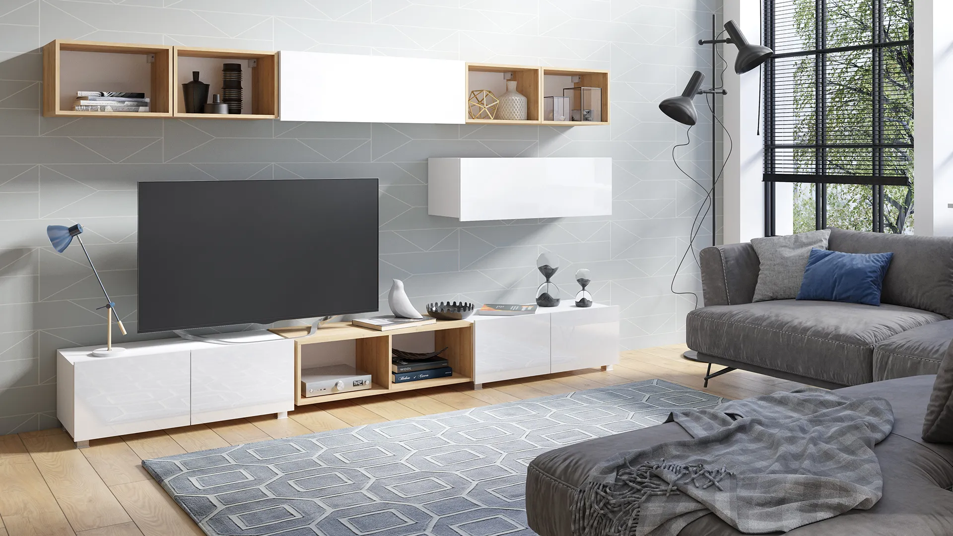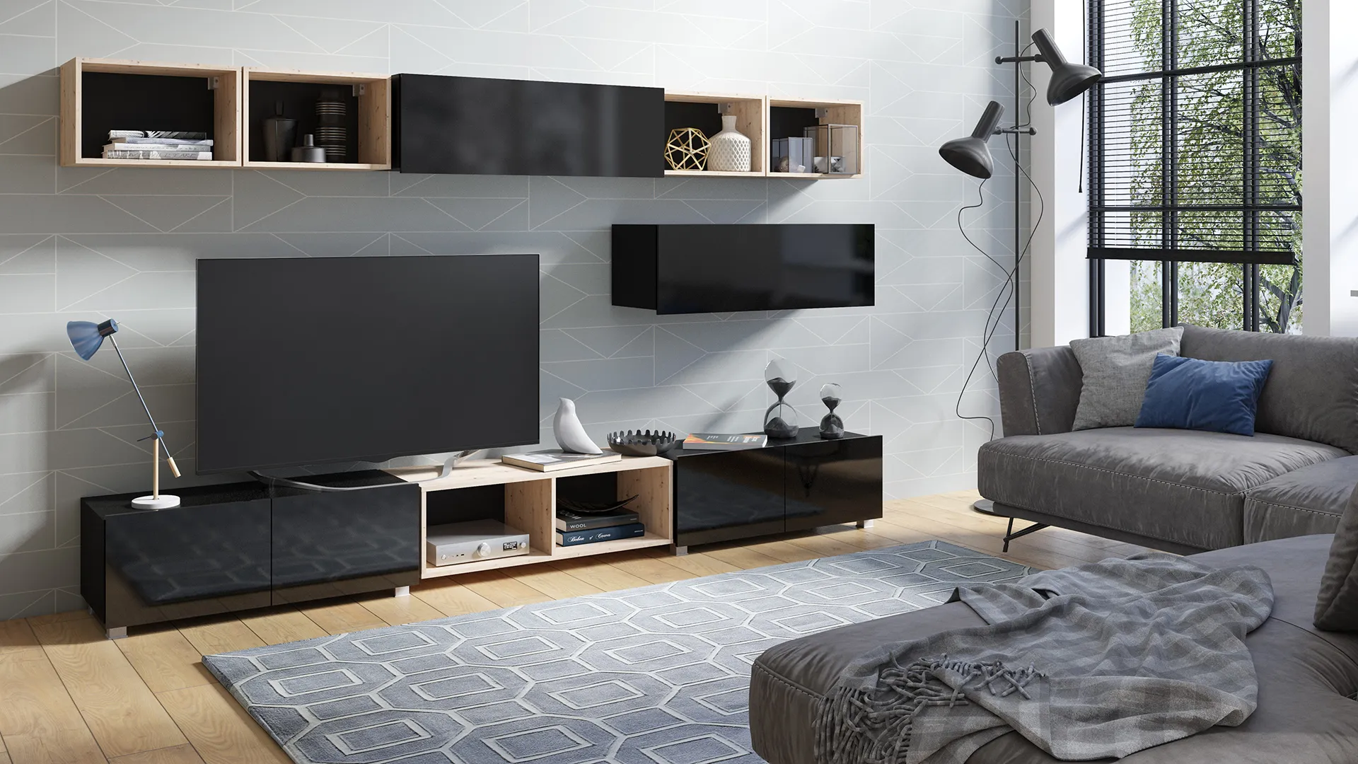 Do wyboru są dwa warianty kolorystyczne, które wyraźnie budują charakter wnętrza. Opcja czarny połysk / czarny mat z akcentem dąb artisan i HDF w kolorze czarnym tworzy mocny, loftowy klimat i podkreśla geometrię brył. Wersja biały połysk / biały mat z detalem dąb złoty oraz HDF białym rozjaśnia salon i świetnie pasuje do aranżacji skandynawskich, oraz minimalistycznych. Niezależnie od wyboru, to zestaw mebli do salonu, który łączy przechowywanie, ekspozycję i spójny wygląd w jednej kompozycji.