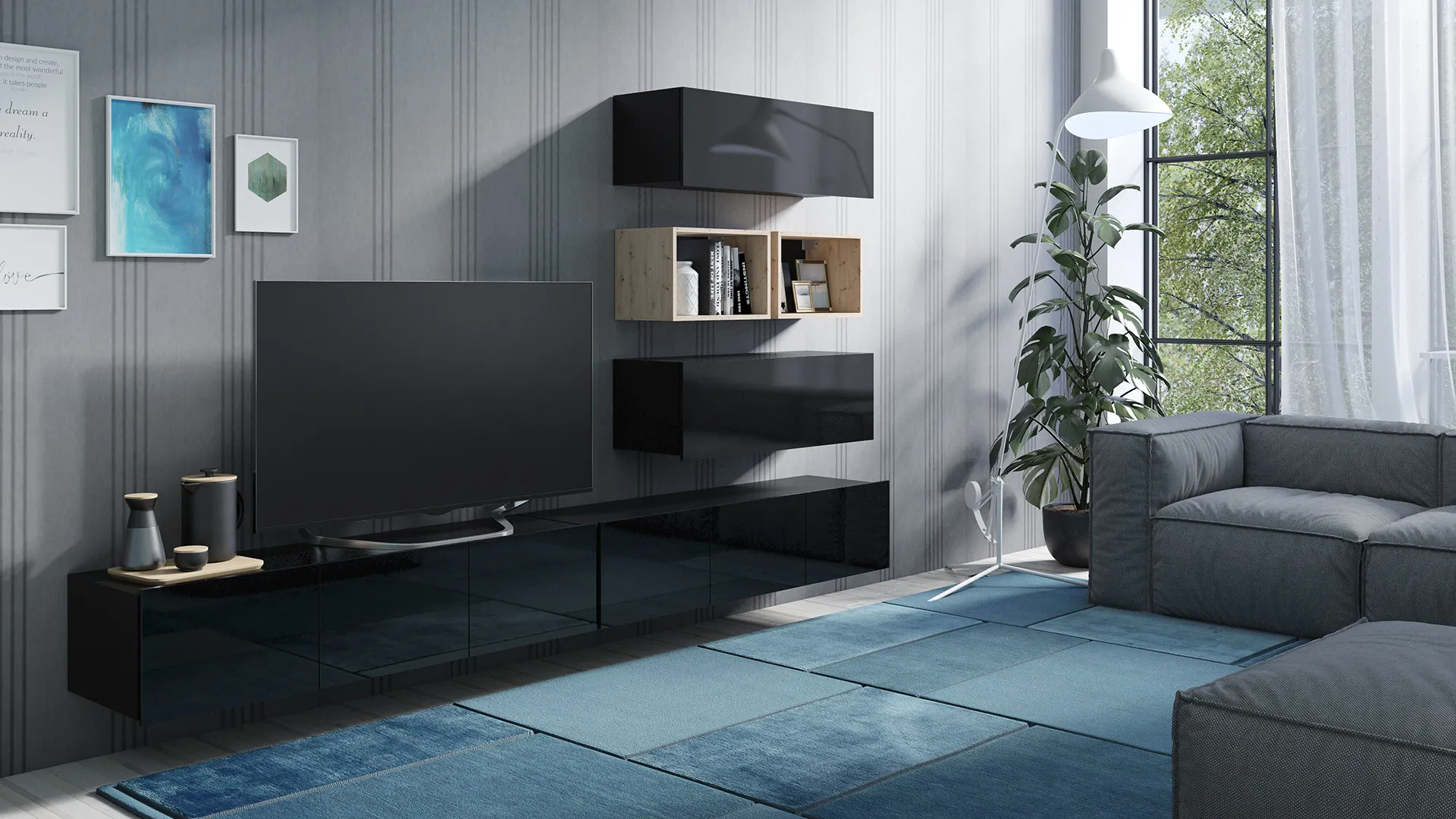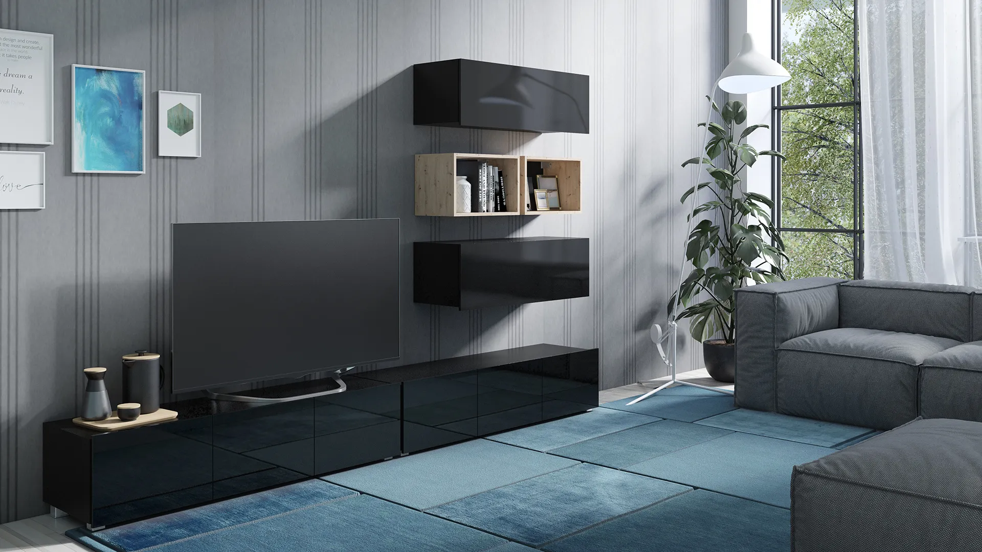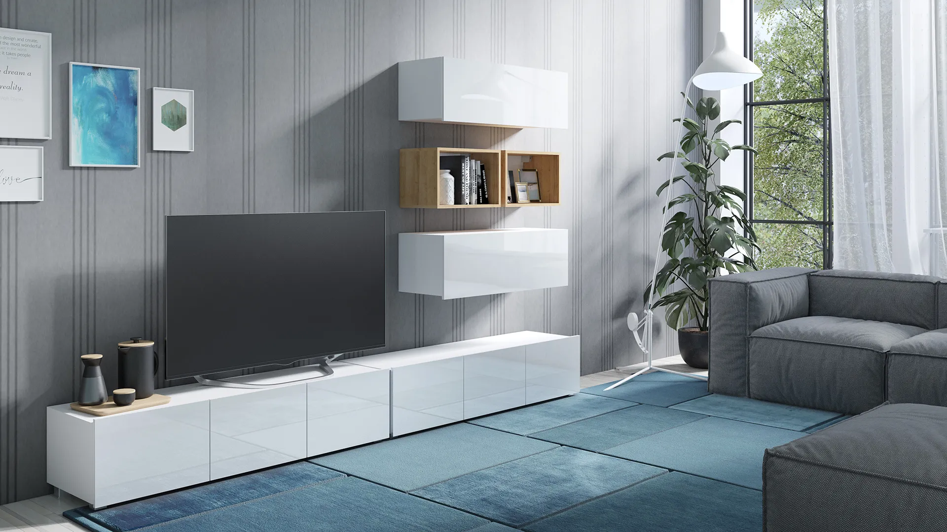 - Zestaw mebli do salonu – nowoczesna meblościanka RTV do strefy telewizora