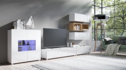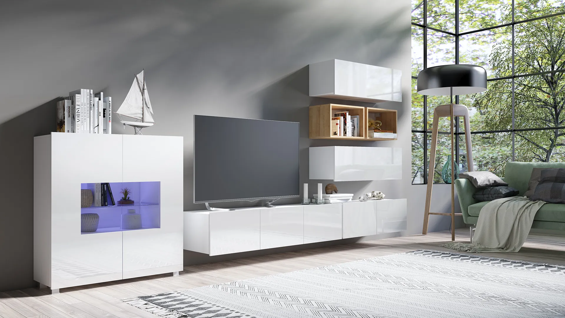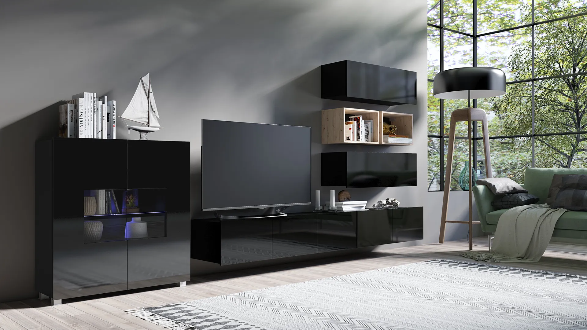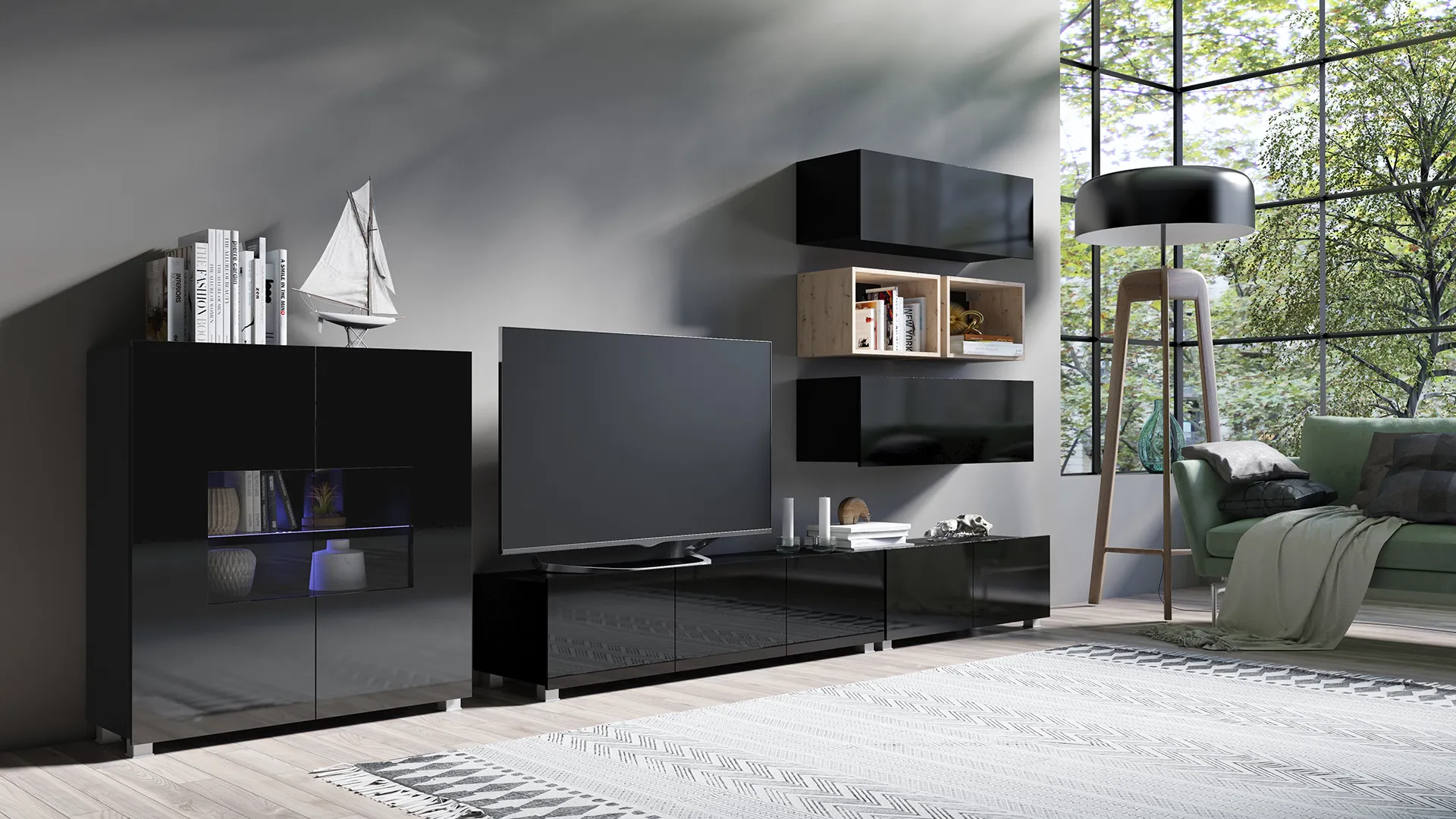 Meblościanka z komodą CALERO C23 – zestaw RTV 150 i 100 cm z półkami wiszącymi oraz podświetlaną komodą LED