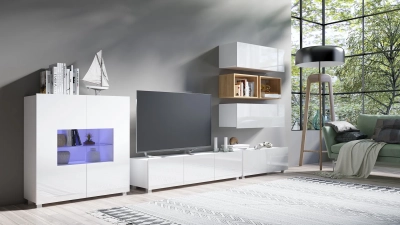 Na co dzień liczy się wygoda – dlatego w szafkach poziomych zastosowano siłowniki gazowe oraz możliwość otwierania od góry i od dołu, co ułatwia dostęp i pozwala dopasować kierunek otwierania do aranżacji. Meble wykonano z płyty wiórowej laminowanej 16 mm, z krawędziami zabezpieczonymi obrzeżem ABS, a stabilność wzmacniają plecy z płyty HDF. W części RTV przewidziano plastikowe nóżki 5 cm, a samą zabudowę możesz zorganizować elastycznie – jako klasyczny zestaw mebli RTV do salonu w wersji stojącej albo jako układ z montażem wiszącym (dla lżejszego efektu i łatwiejszego sprzątania).