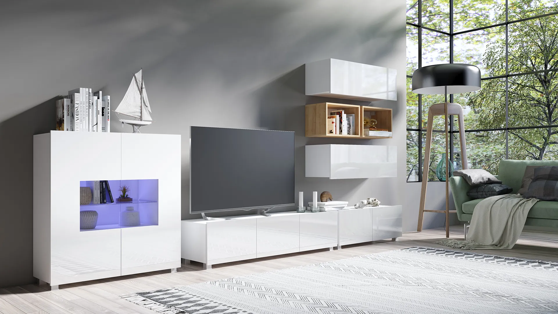 Meblościanka z komodą CALERO C23 to funkcjonalny, nowoczesny komplet, który porządkuje strefę telewizora i daje wygodne miejsce na przechowywanie w salonie. Zestaw łączy dwie szafki RTV (150 cm i 100 cm) z komodą dwudrzwiową, a całość uzupełniają 2 półki wiszące poziome zamknięte oraz 2 małe półki otwarte na dekoracje i książki. Gładkie fronty bez uchwytów budują minimalistyczny efekt, a układ brył pozwala stworzyć estetyczną meblościankę do salonu dopasowaną do wielkości ściany i Twoich potrzeb.