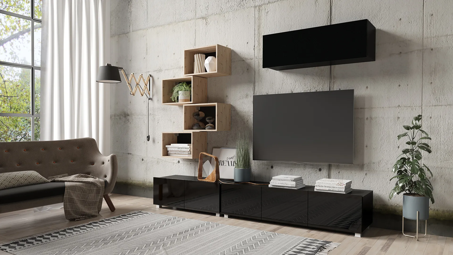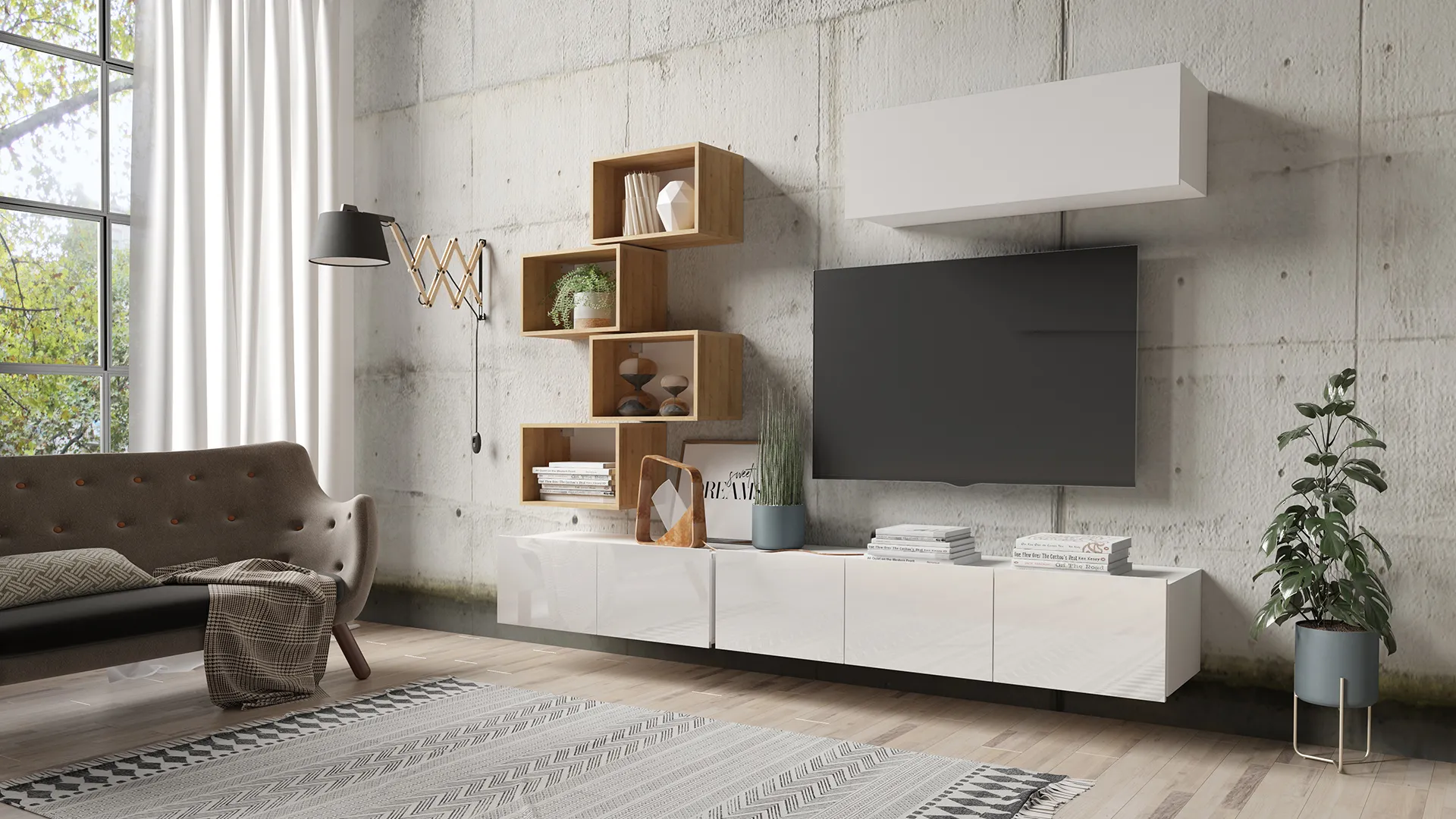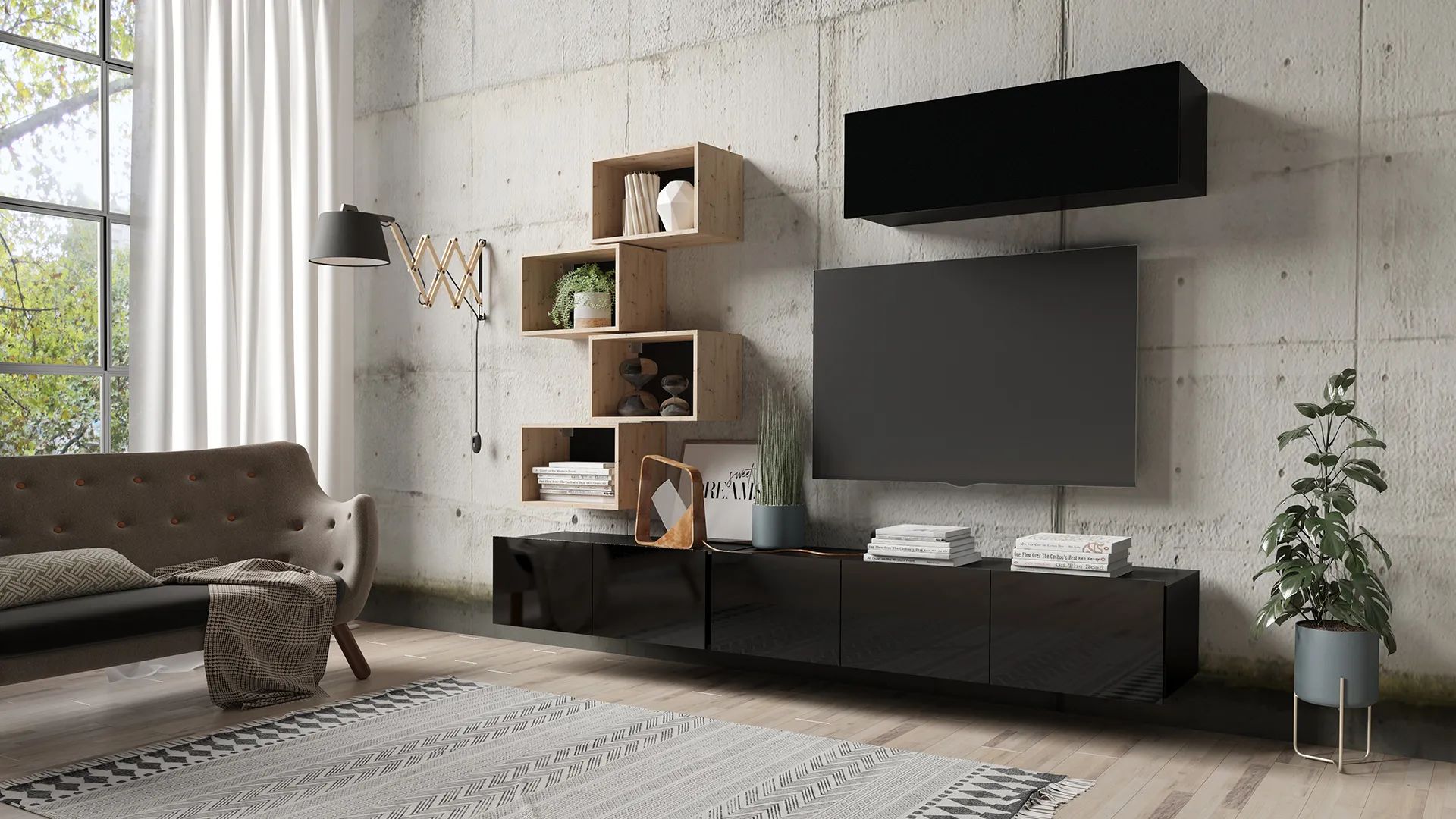 Meblościanka CALERO C24 – zestaw RTV 150 i 100 cm z zamykaną półką wiszącą oraz 4 otwartymi półkami na dekoracje