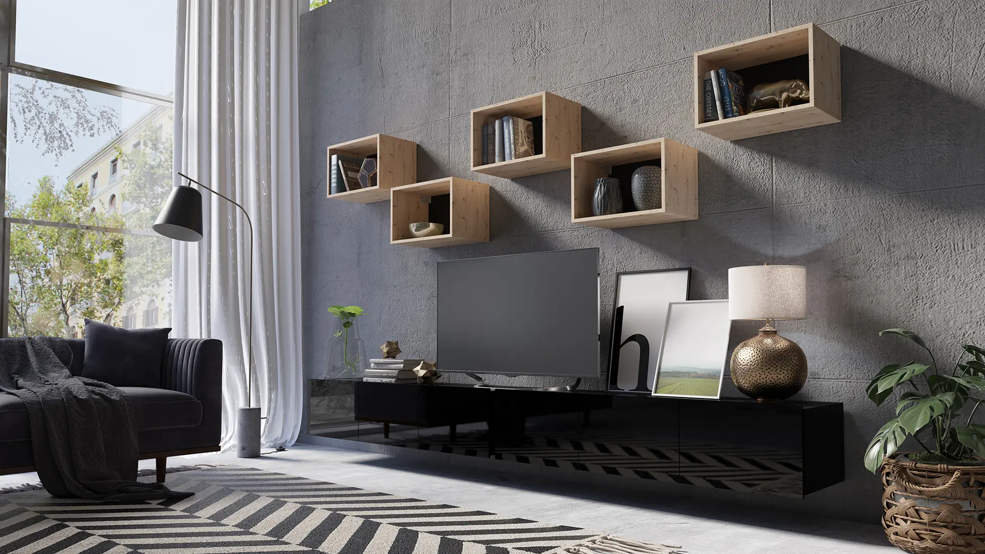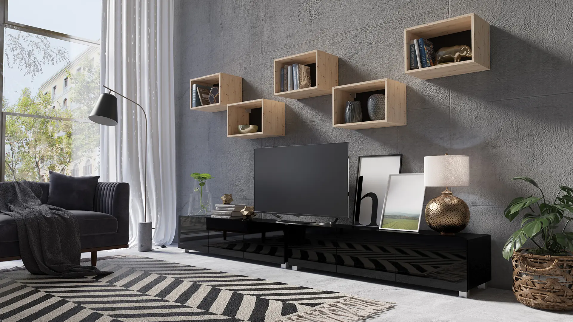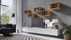 Zestaw mebli do salonu CALERO C27 to lekka wizualnie, nowoczesna meblościanka, która porządkuje strefę telewizora i dodaje ścianie charakteru. W komplecie otrzymujesz 2x szafkę RTV 150 cm – idealną jako długa szafka pod telewizor – oraz 5 małych półek otwartych, które świetnie sprawdzają się na książki, ozdoby i drobne dodatki. Gładkie fronty bez uchwytów i prosta bryła pasują do nowoczesnych wnętrz, a modułowe półki pozwalają ułożyć kompozycję dokładnie tak, jak lubisz.