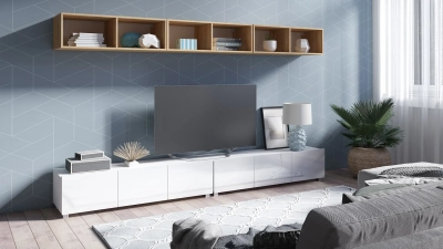 Meble wykonano z płyty wiórowej laminowanej 16 mm i wykończono trwałym obrzeżem ABS, dzięki czemu całość dobrze znosi codzienne użytkowanie. Zastosowane plecy z płyty HDF wzmacniają konstrukcję, a szafki RTV stoją na plastikowych nóżkach 5 cm, co ułatwia utrzymanie porządku pod meblem. W zależności od aranżacji możesz postawić na wersję klasyczną lub nowoczesny „floating look”, bo zestaw daje możliwość montażu RTV stojącą lub wiszącą.