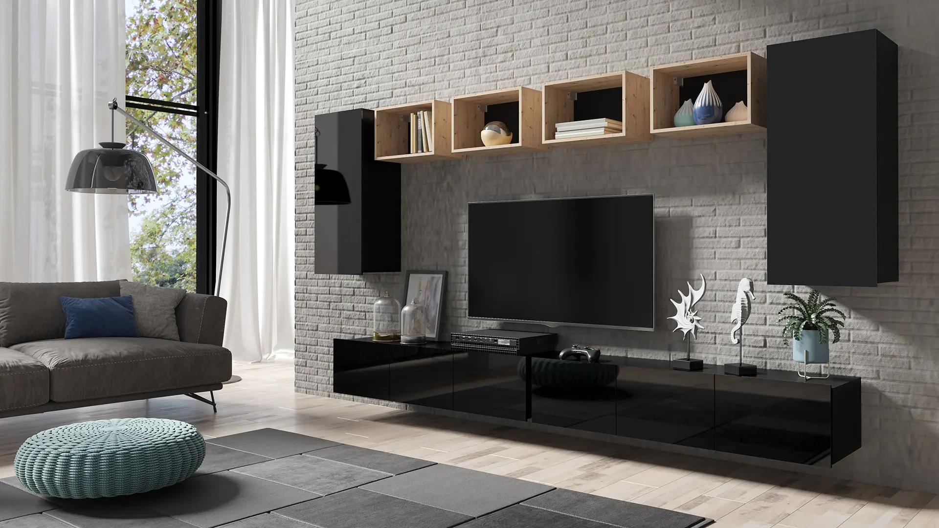Zestaw wykonano z płyty wiórowej laminowanej 16 mm, a krawędzie zabezpieczono trwałym obrzeżem ABS. Gładkie fronty bez uchwytów podkreślają nowoczesny charakter i ułatwiają dopasowanie mebli do różnych dodatków. Szafki RTV oparto na plastikowych nóżkach 5 cm, co pomaga w utrzymaniu czystości pod meblami, a plecy z płyty HDF wzmacniają konstrukcję. Dodatkowo masz możliwość montażu RTV stojącą lub wiszącą – dzięki temu dopasujesz układ do ściany, wysokości telewizora i własnych preferencji.