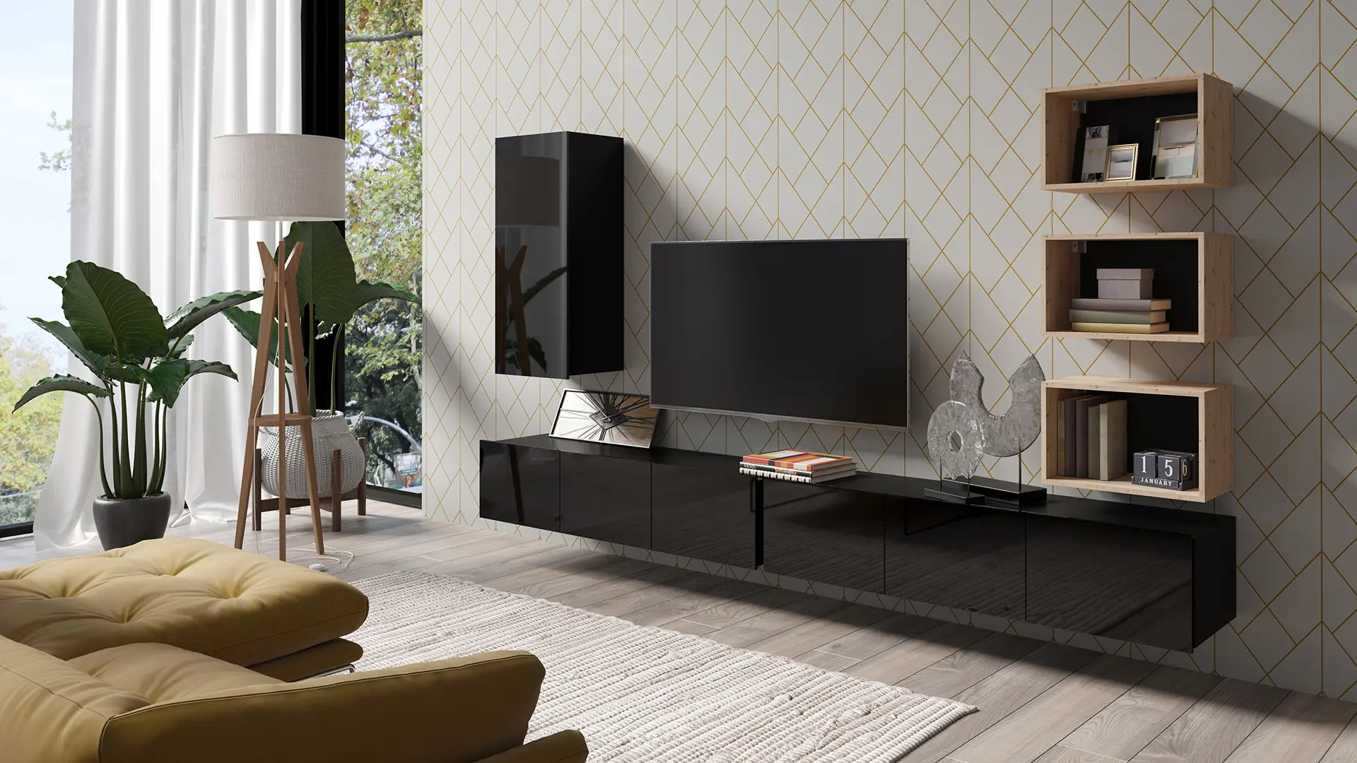 Meble wykonano z płyty wiórowej laminowanej 16 mm, a krawędzie zabezpieczono trwałym obrzeżem ABS, co dobrze sprawdza się w intensywnie użytkowanym salonie. Fronty bez uchwytów podkreślają nowoczesny styl i ułatwiają utrzymanie spójnej, „czystej” linii zabudowy. Szafki RTV stoją na plastikowych nóżkach 5 cm, co ułatwia sprzątanie pod meblami, a plecy z płyty HDF stabilizują korpusy. Dodatkowo możesz dopasować układ do ściany i wysokości telewizora, bo jest możliwość montażu RTV stojącą lub wiszącą.