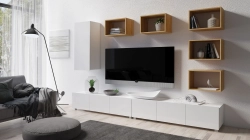 Meblościanka do salonu CALERO C32 to nowoczesny zestaw mebli do salonu, który pomaga stworzyć uporządkowaną i estetyczną strefę telewizyjną. W komplecie znajdują się 2x szafka RTV 150 cm, dzięki czemu zyskujesz długą, wygodną szafkę pod telewizor z miejscem na sprzęt, akcesoria i wszystko to, co chcesz schować z pola widzenia. Zabudowę uzupełnia półka wisząca pionowa zamknięta oraz 5 małych półek zamkniętych – idealnych do przechowywania drobiazgów, dokumentów, ładowarek czy kolekcji płyt. Taka konstrukcja dobrze sprawdza się w salonie, gdzie liczy się porządek i spójny wygląd, a meblościanka meble pokojowe mają „robić tło” dla aranżacji.