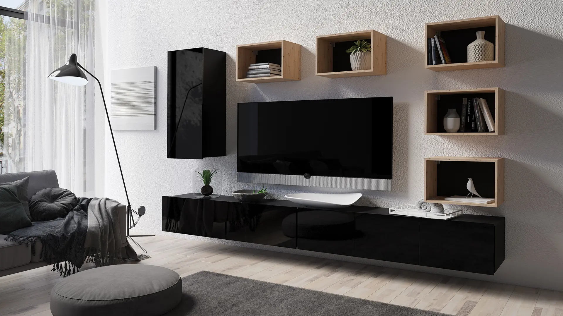 Meblościanka do salonu CALERO C32 – 2 szafki RTV 150 cm, pionowa szafka wisząca i 5 zamkniętych półek