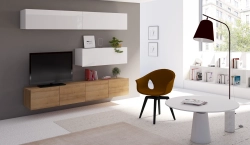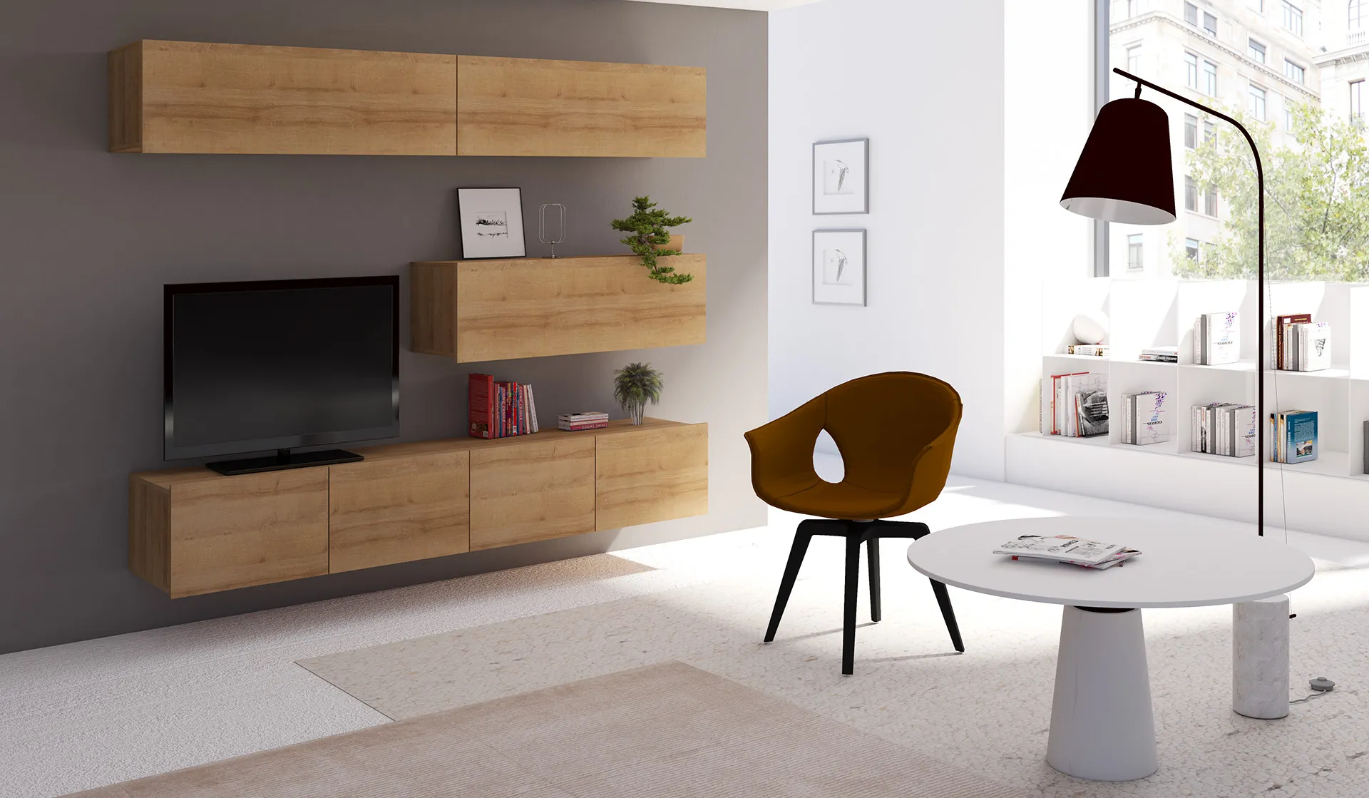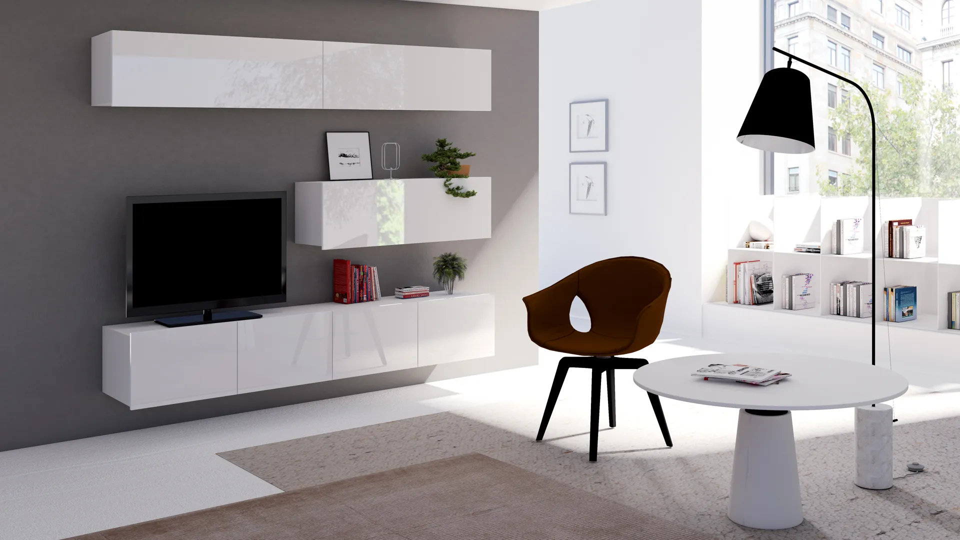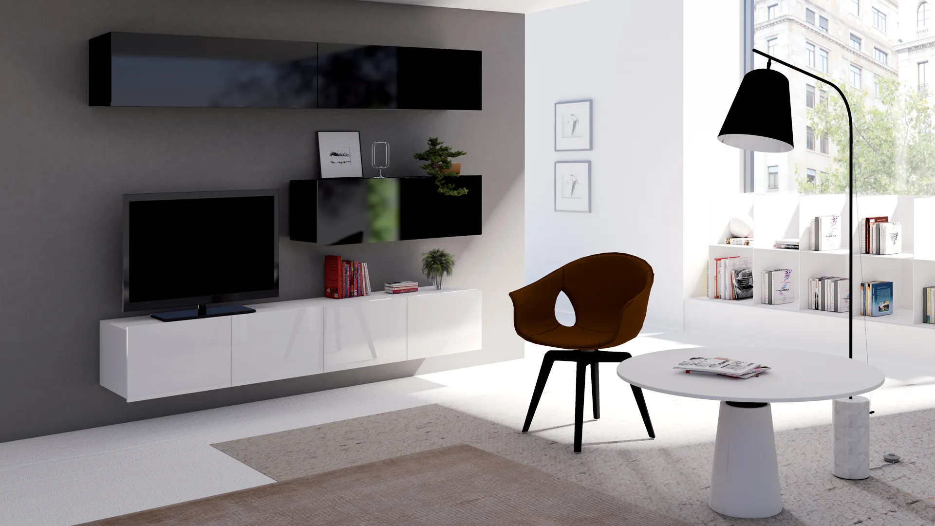 Meblościanka do salonu CALERO C8 to minimalistyczny układ do strefy telewizora, który pomaga utrzymać porządek i stworzyć spójną zabudowę ściany bez nadmiaru brył. Zestaw składa się z 5 elementów: 2 szafek RTV 100 cm oraz 3 zamkniętych półek wiszących – dzięki temu zyskujesz miejsce na sprzęt i akcesoria, a jednocześnie możesz schować to, co nie powinno być na widoku.