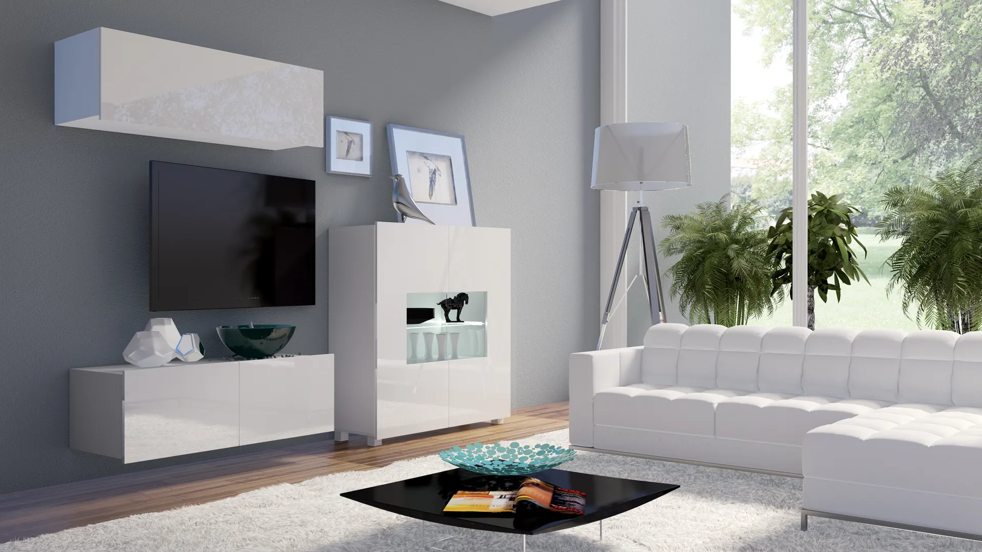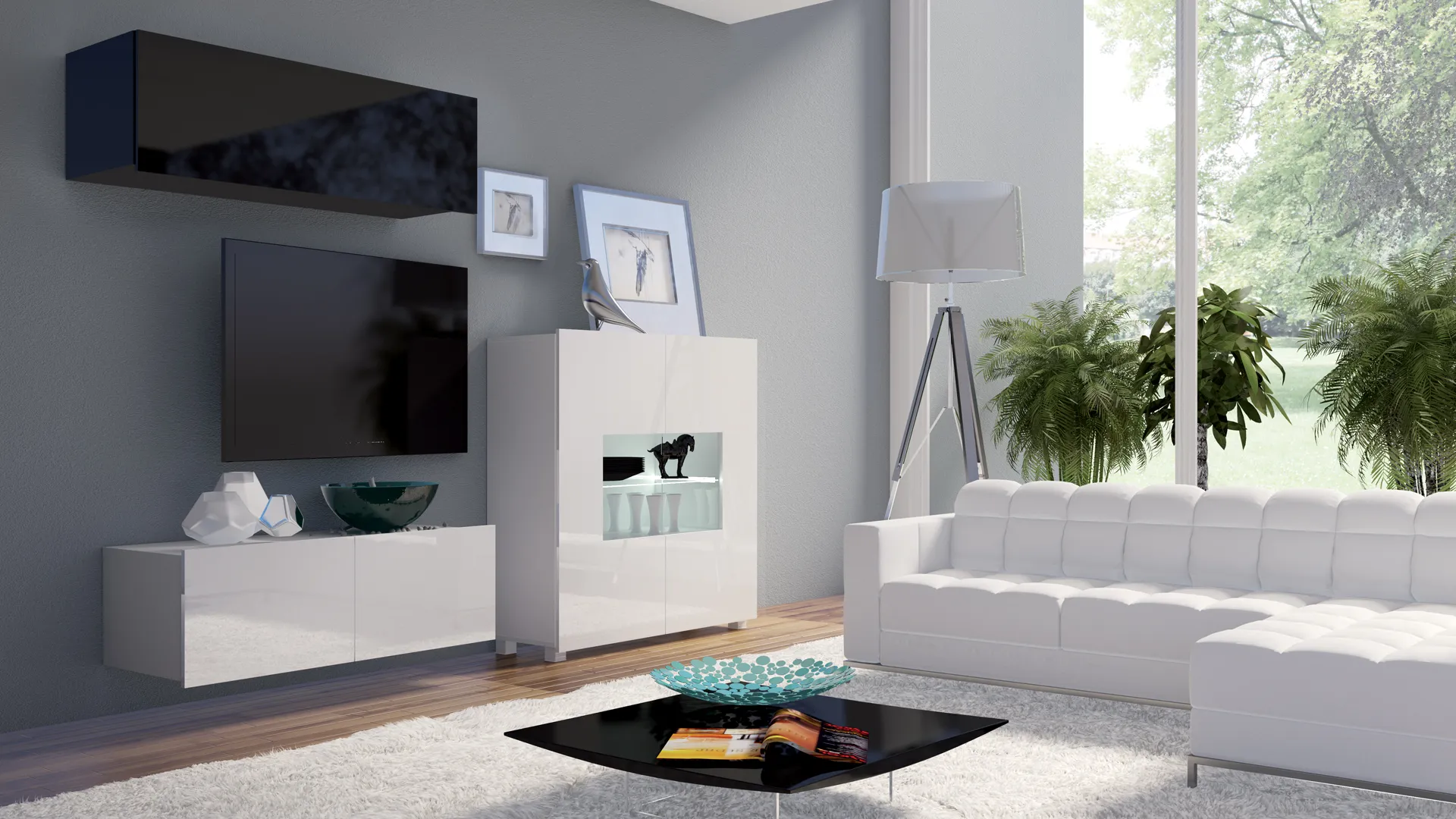 To praktyczne meble pokojowe do codziennego użytkowania: bezuchwytowe fronty utrzymują minimalistyczną linię, a płyta laminowana 16 mm z obrzeżem PCV dobrze znosi intensywne korzystanie. Szafkę RTV możesz zamontować wisząco, żeby optycznie odciążyć strefę telewizora i ułatwić sprzątanie, albo postawić w opcji stojącej – ze srebrnymi nóżkami 5 cm. W komodzie zastosowano szkło hartowane, a jako opcję możesz dobrać oświetlenie LED, które podkreśla wnętrze i wieczorem robi przyjemny klimat.