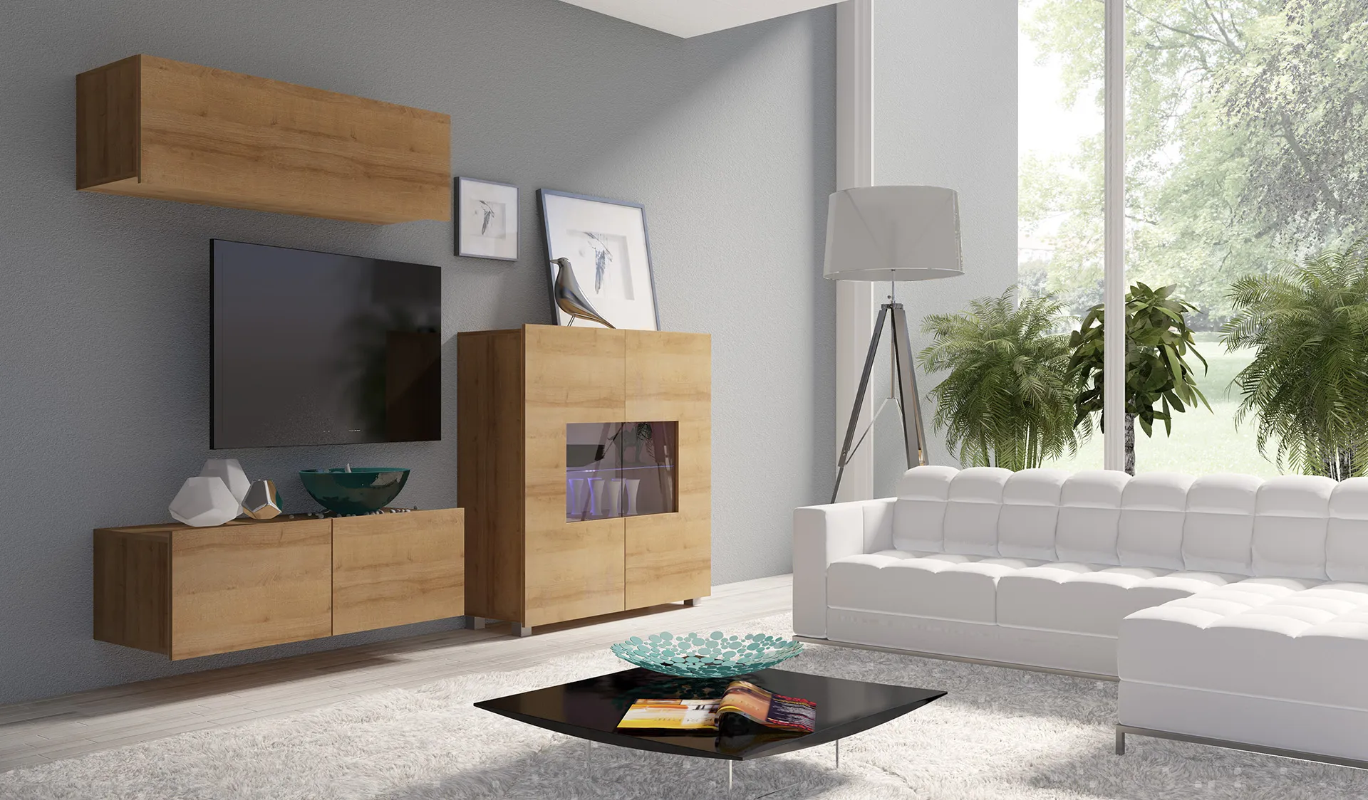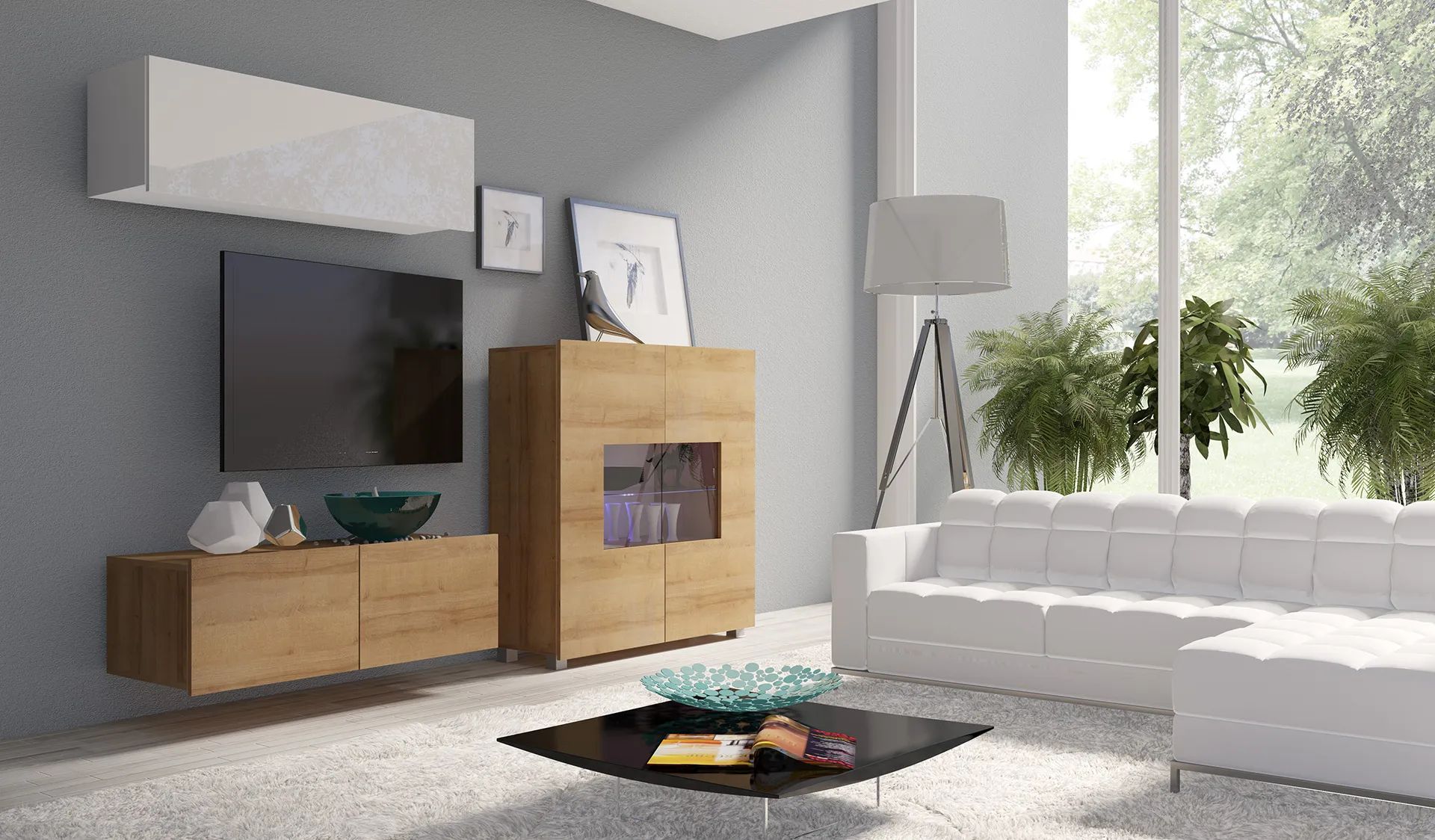 Meblościanka CALERO C9 – szafka RTV 100 cm, zamknięta półka wisząca i komoda dwudrzwiowa do salonu