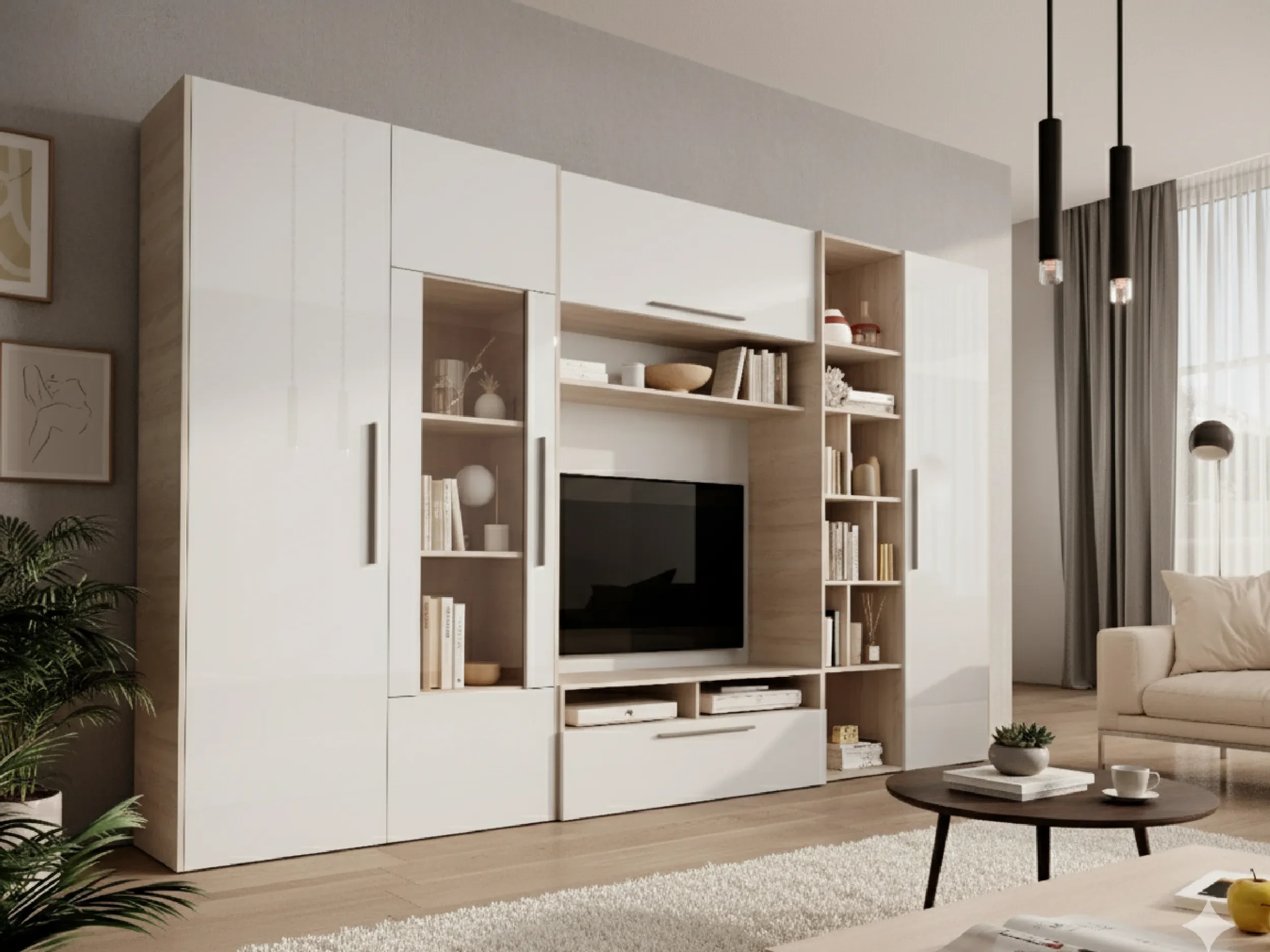 - Kompletny zestaw do salonu – w skład meblościanki wchodzą dwie szafki, witryna, regał, szafka RTV oraz półka wisząca.