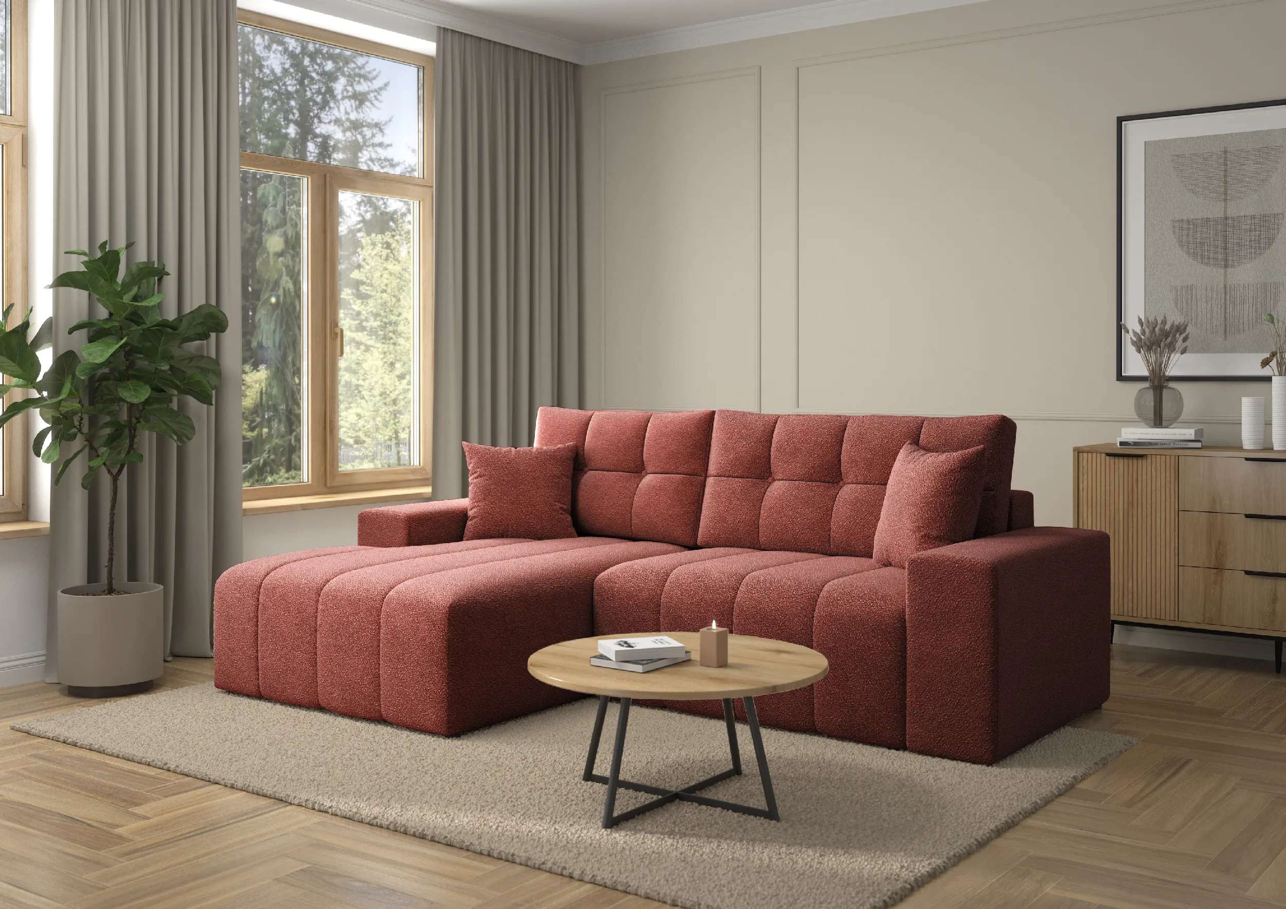 Model został zaprojektowany tak, aby ułatwiać codzienne korzystanie z przestrzeni. Pojemnik na pościel pomaga uporządkować koce, poduszki i tekstylia, a wolnostojąca forma z tyłem obitym tkaniną daje większą swobodę ustawienia. Całość opiera się na solidnym stelażu z listew drewnianych i płyty wiórowej 16 mm, dlatego mebel dobrze wpisuje się w potrzeby osób, które szukają rozwiązania łączącego estetykę z wygodą. Jeśli zależy Ci na modelu, który dobrze wygląda i jest po prostu praktyczny, ten narożnik rozkładany z funkcją spania będzie bardzo dobrym wyborem.