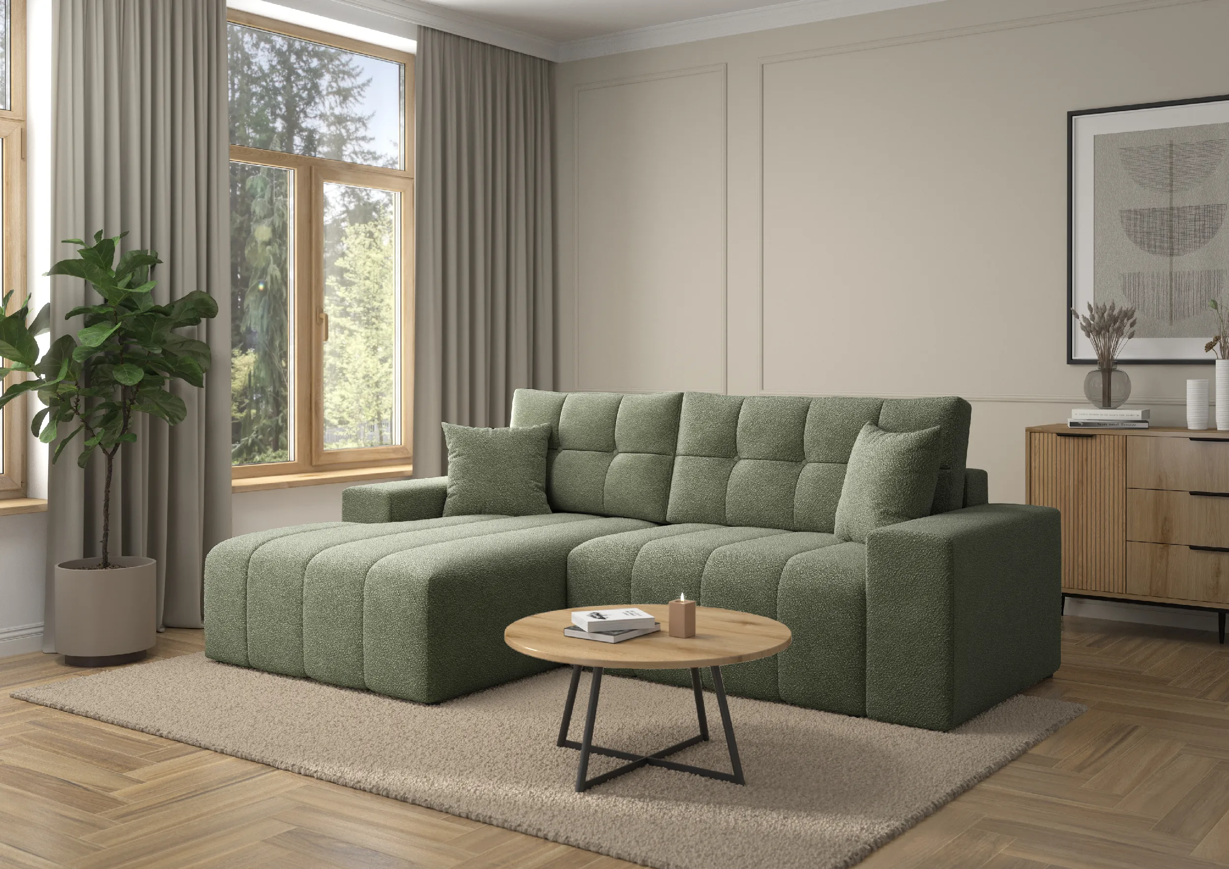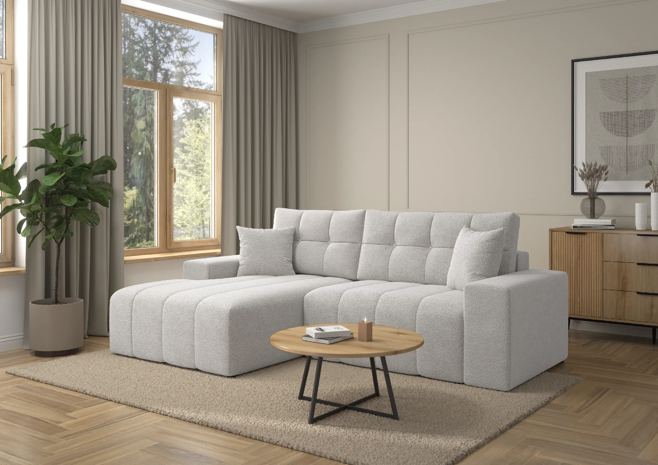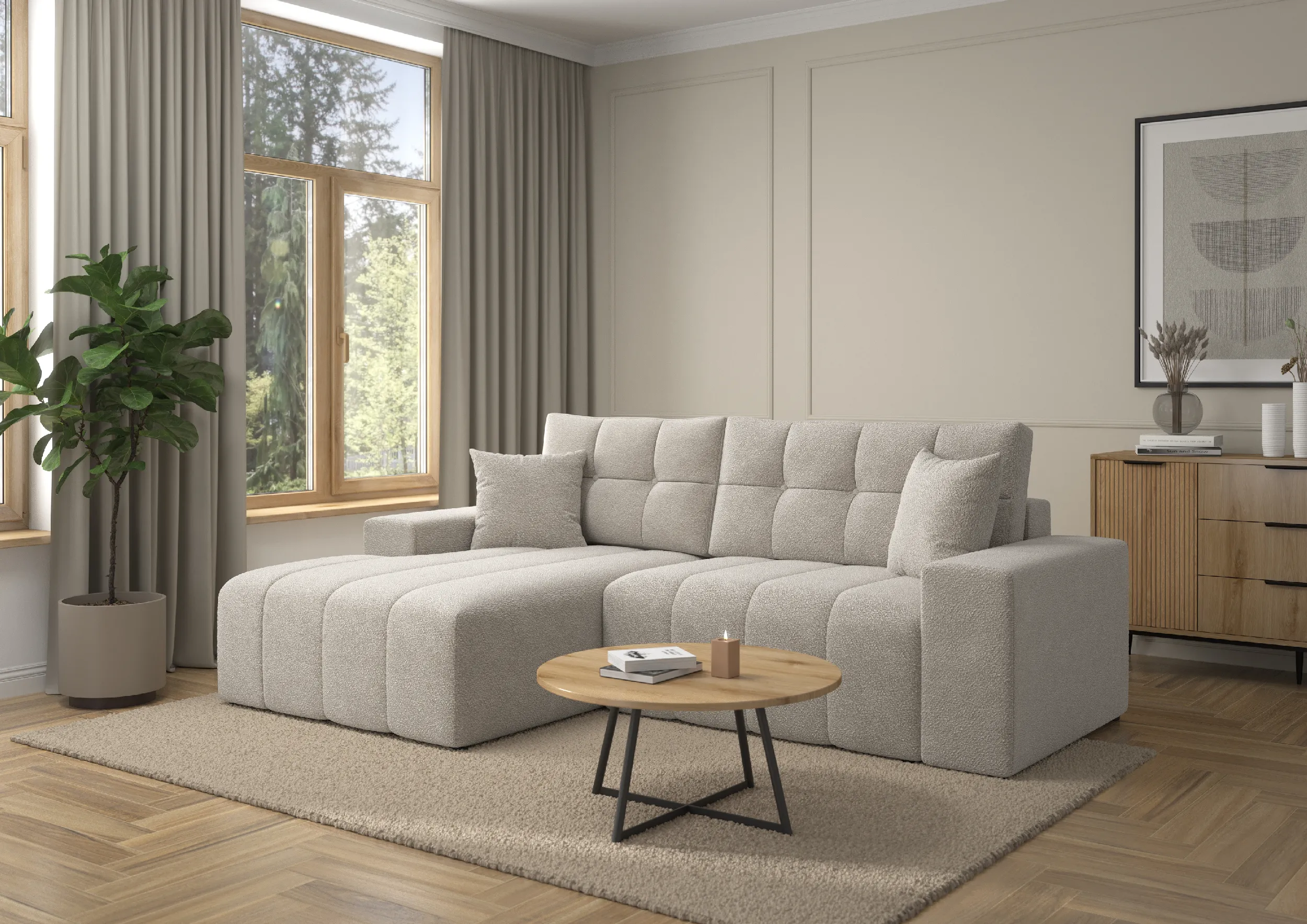 W codziennym użytkowaniu duże znaczenie ma nie tylko wygląd, ale też praktyczna strona mebla. Ten narożnik z funkcją spania został wyposażony w system DL, dzięki czemu rozkładanie jest szybkie i wygodne. Siedzisko oraz oparcie z pianki T30 i sprężyn bonellowych zapewniają odpowiedni komfort podczas siedzenia i odpoczynku, a po rozłożeniu mebel zyskuje funkcjonalną powierzchnię do spania. To rozwiązanie, które sprawdza się wtedy, gdy salon ma pełnić także dodatkową funkcję noclegową.