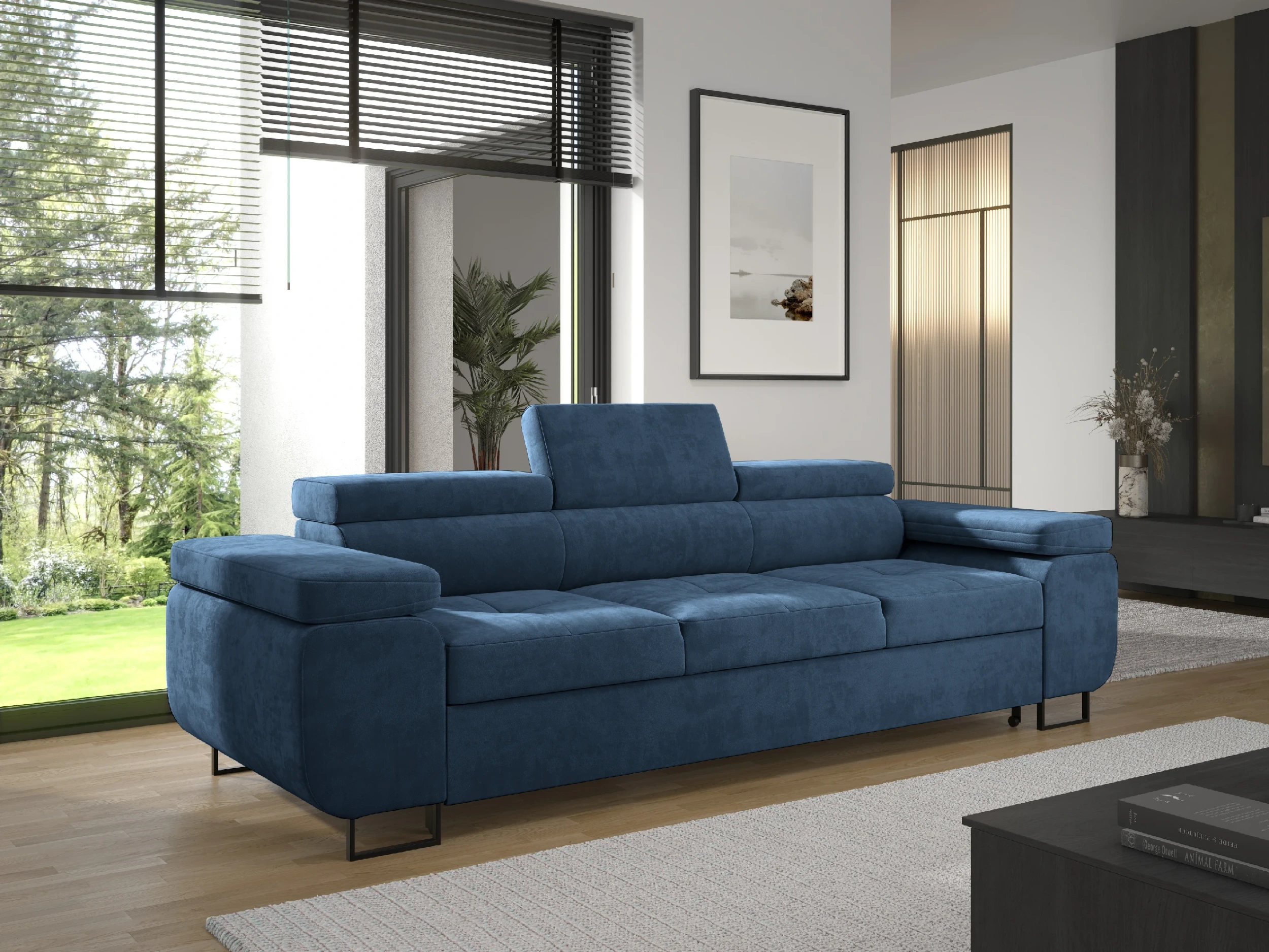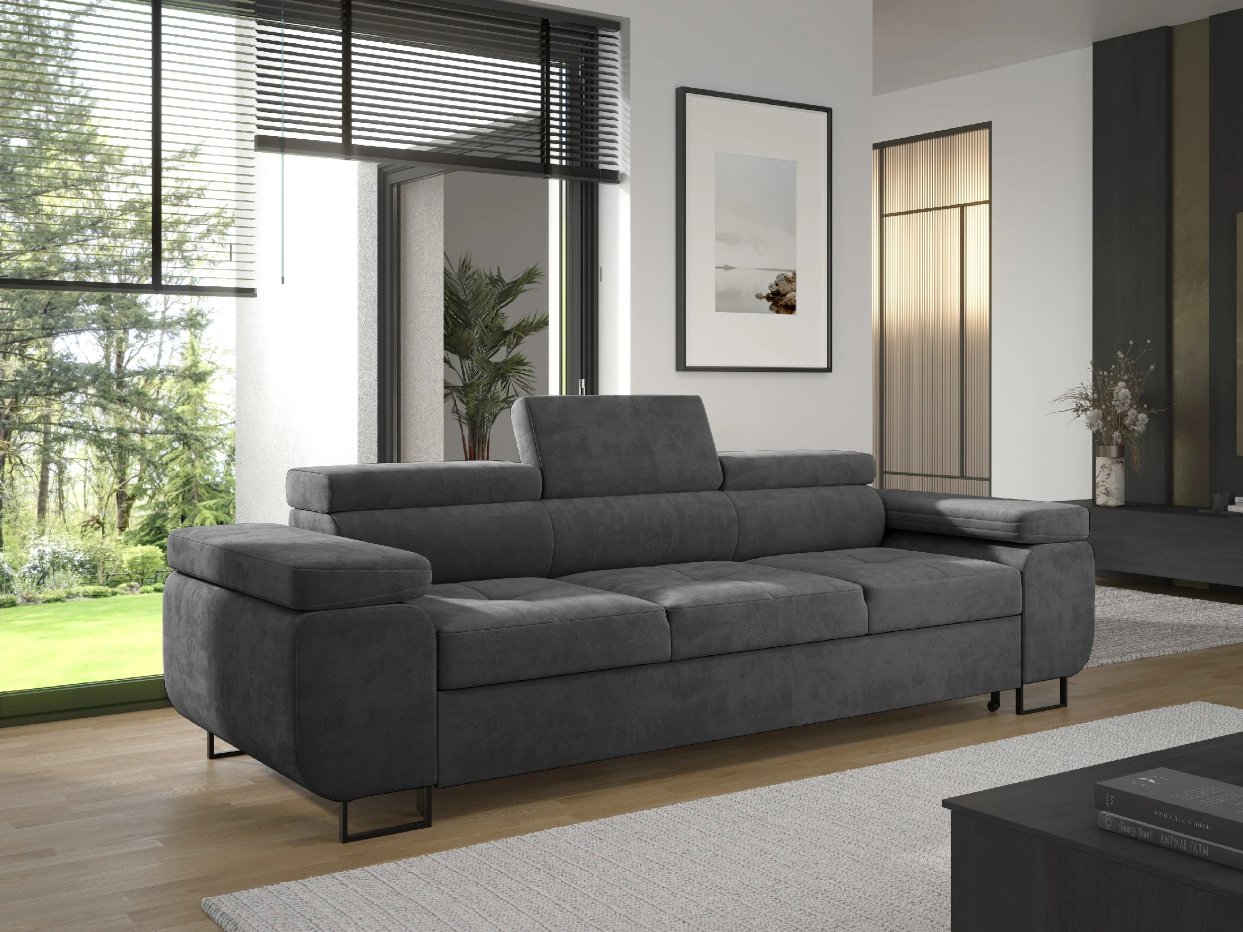 Funkcja spania o wymiarach 190 × 130 cm pozwala szybko przekształcić sofę w komfortowe miejsce do nocnego odpoczynku. System rozkładania typu delfin działa lekko i intuicyjnie, dzięki czemu kanapa doskonale sprawdza się zarówno na co dzień, jak i dla gości.