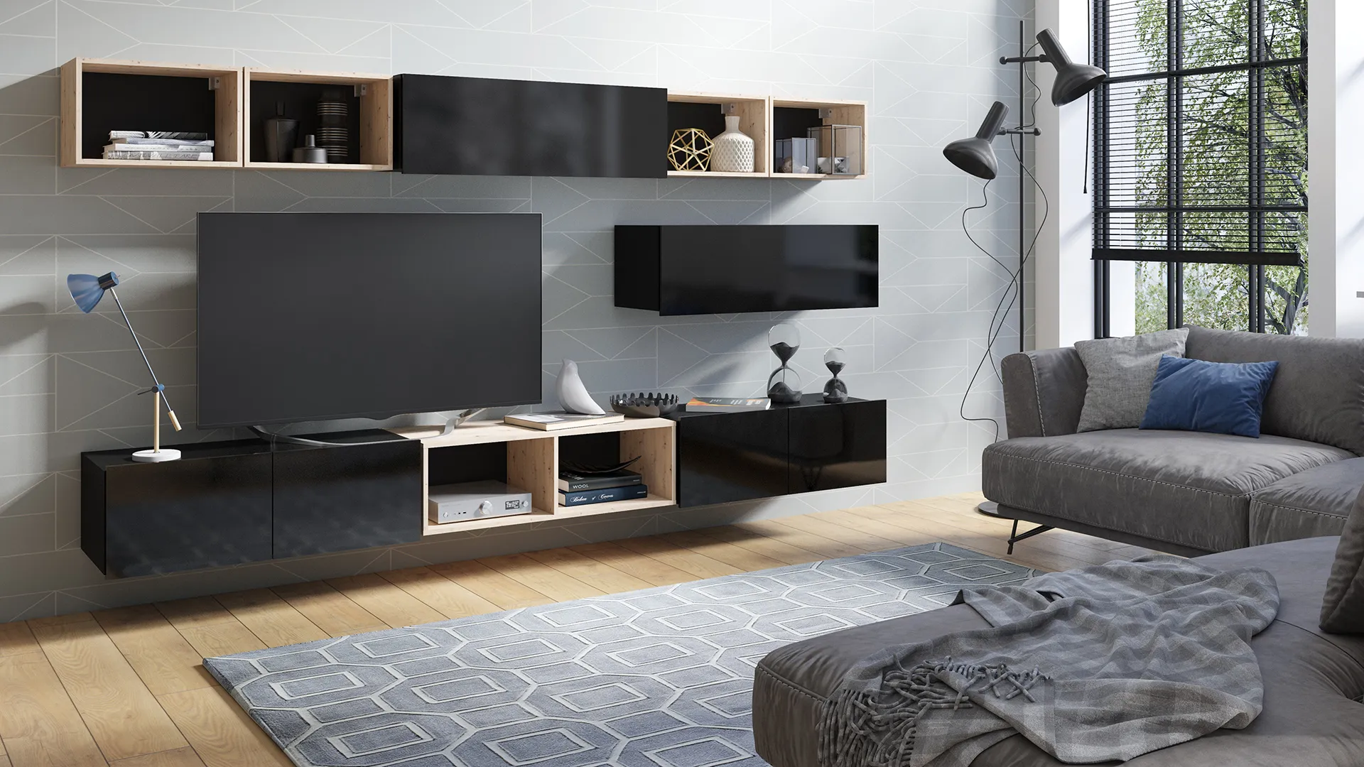 - Półka wisząca 100 cm – wygodna organizacja strefy RTV i miejsca na dekoracje w jednym ciągu