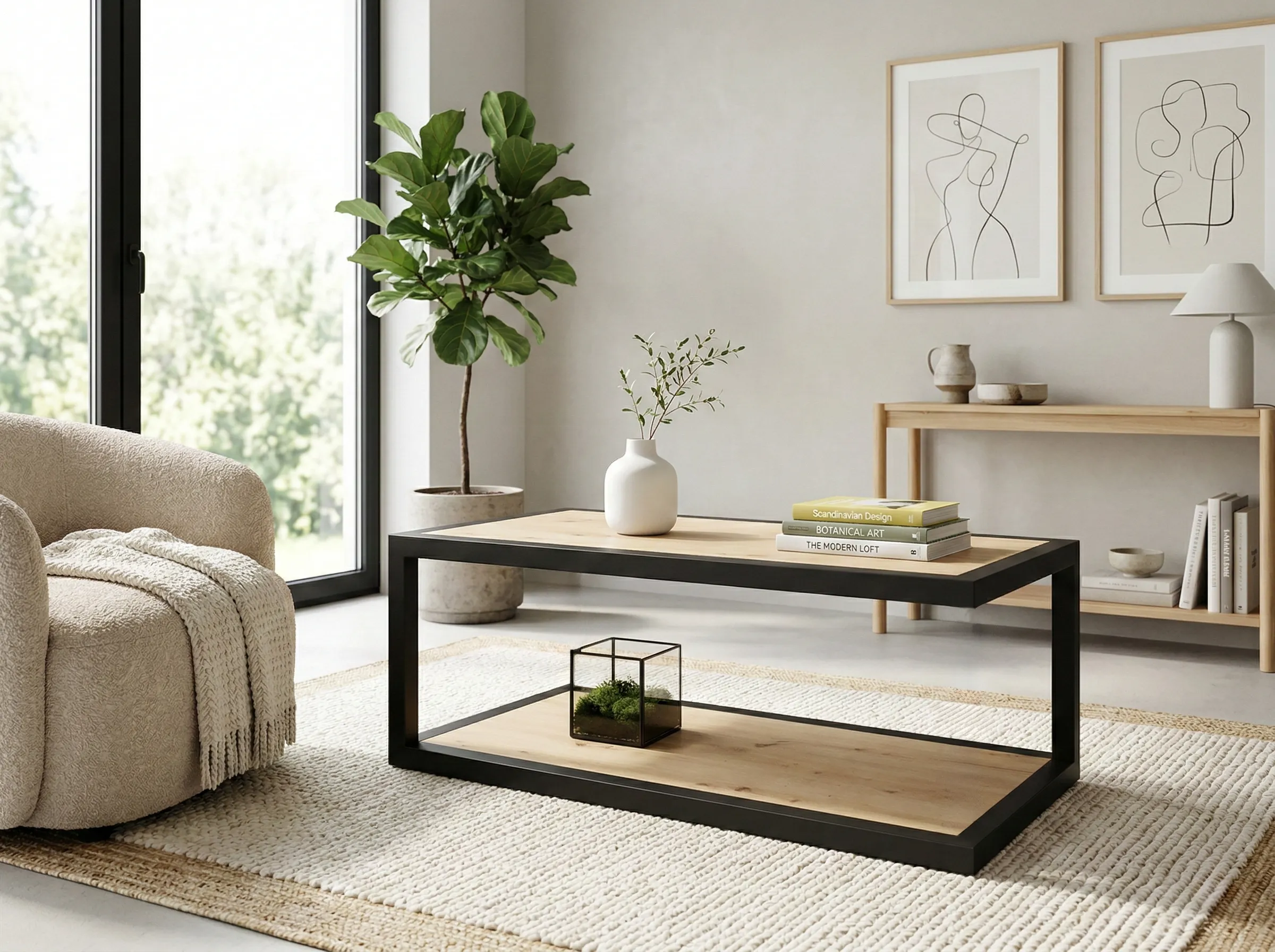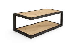 Stolik kawowy Duvo – loftowy duet blatów z półką, stalowa rama i metalowe nogi
